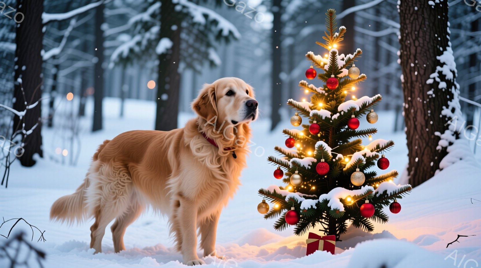 雪景色の中に、飾り付けられたクリスマスツリーとゴールデンレトリバーが描かれています。犬は雪原に立ち、ツリーの方をじっと見つめており、その表情は穏やかで優しげです。背景には木々が立ち並び、雪が降り積もっている様子から、静かで温かい冬の雰囲気が伝わってきます。