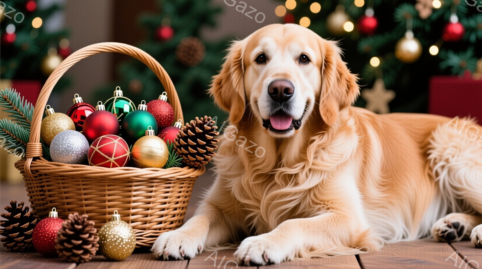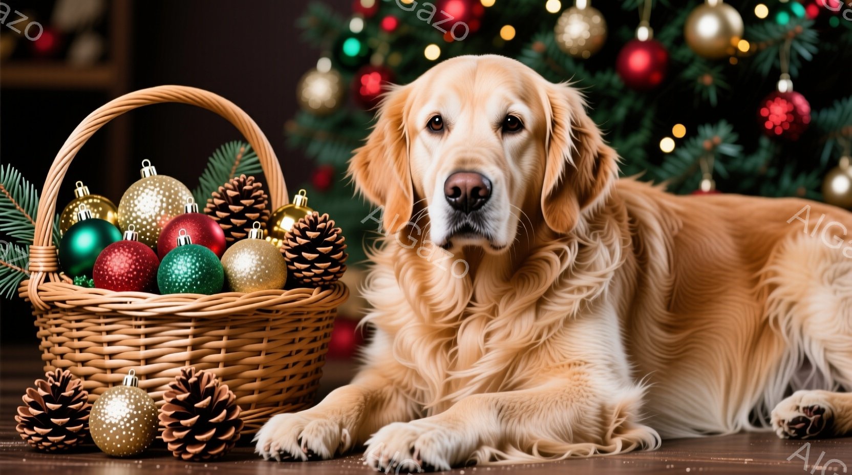 ゴールデンレトリバーが白い敷物の上に横たわり、近くには松ぼっくりやクリスマスオーナメントが詰まったバスケットが置かれています。犬は穏やかな表情でカメラを見つめ、背景にはクリスマスツリーがぼんやりと見え、暖かくお祝いムードを醸し出しています。全体的に、この画像は、ホリデーシーズンに愛犬との温かい時間を過ごしている様子を表しています。