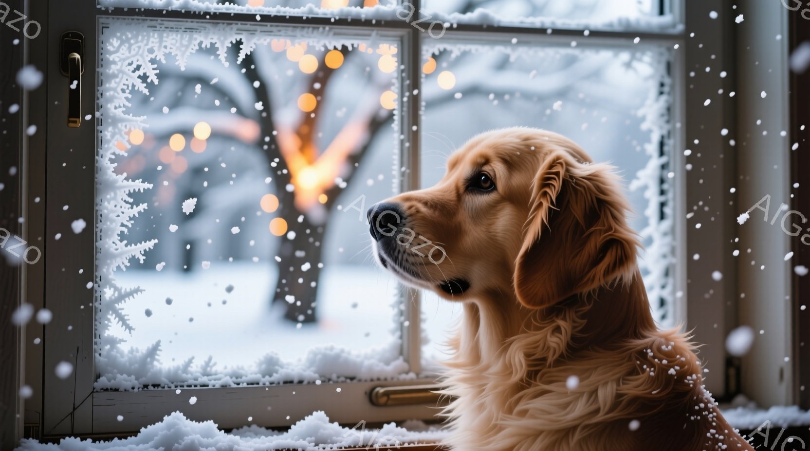 窓辺に座るゴールデンレトリバーが、雪景色を優しい眼差しで見つめている。窓枠には雪の結晶模様が描かれ、背景にはぼんやりと輝く光の点々が広がる冬の風景が広がっている。暖かく穏やかな雰囲気で、犬の柔らかな毛並みと雪景色とのコントラストが印象的だ。