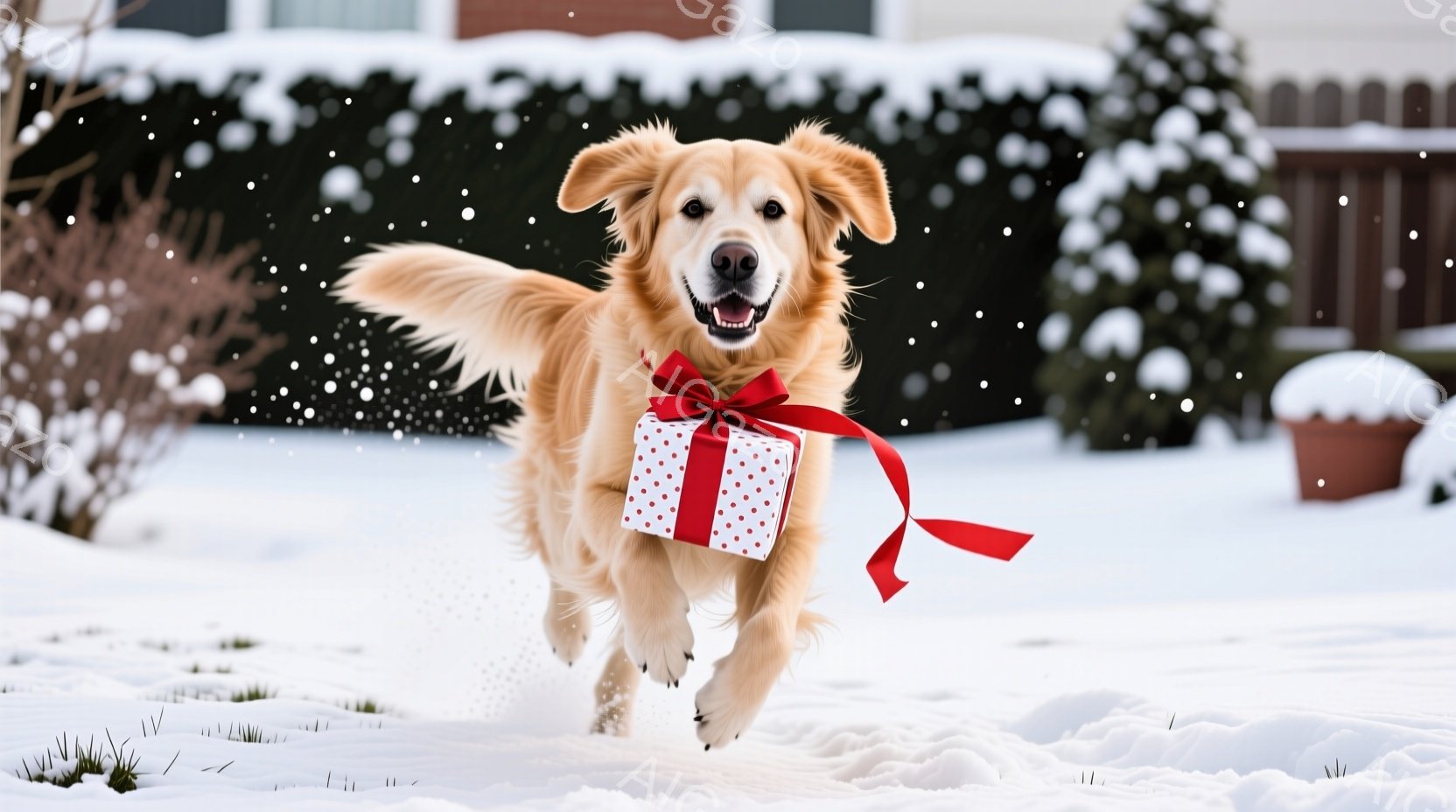 雪景色の中で、プレゼントをくわえたゴールデンレトリバーが勢いよく走っている。犬は喜びにあふれた表情で、赤いリボンが風になびき、背景には雪に覆われた庭とフェンス、そしてぼんやりとした建物が見える。全体的に、暖かく幸せな冬の雰囲気が漂っている。