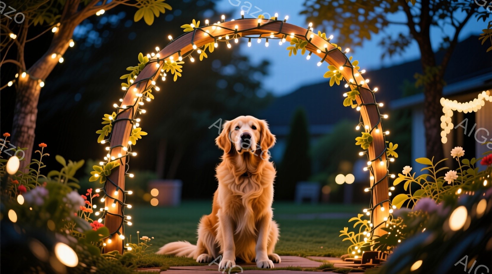 美しいゴールデンレトリバーが、花と電飾で飾られたアーチの前に座っています。犬は穏やかな表情で、カメラに向かってまっすぐ見つめており、背景には緑豊かな芝生と薄暗い光の中で見える家があります。全体的に、暖かく、平和で、牧歌的な雰囲気です。