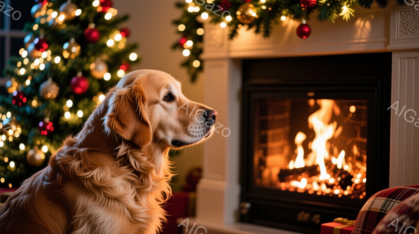 ゴールデンレトリバーが暖炉の前でリラックスした様子が写っています。クリスマスツリーが飾られ、プレゼントボックスが置かれ、室内は温かく、お祝いの雰囲気に包まれています。犬は少し横を向き、穏やかな表情で、暖炉の火を見つめているようです。
