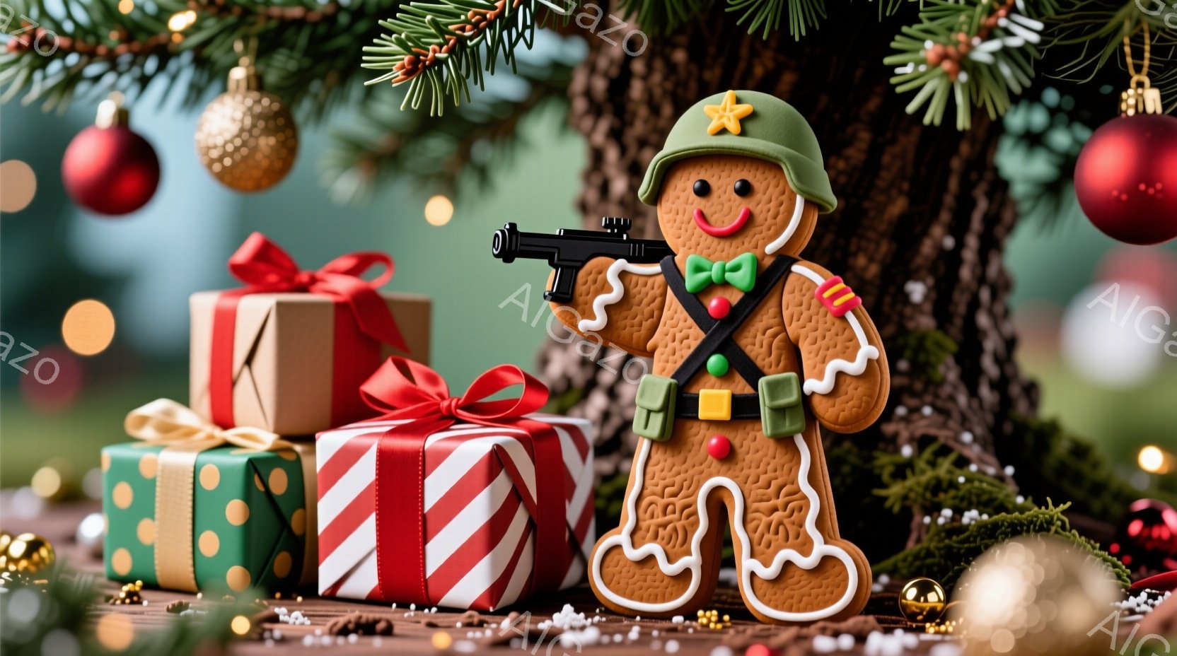 クリスマスツリーの足元に、兵隊の格好をしたジンジャーブレッドマンが立っている。彼は緑色のヘルメットと軍服を着て、黒いブーツを履き、小銃を持っている。背景には、プレゼントが積み重なり、木にはオーナメントや光が飾られており、全体的に祝祭的な雰囲気である。