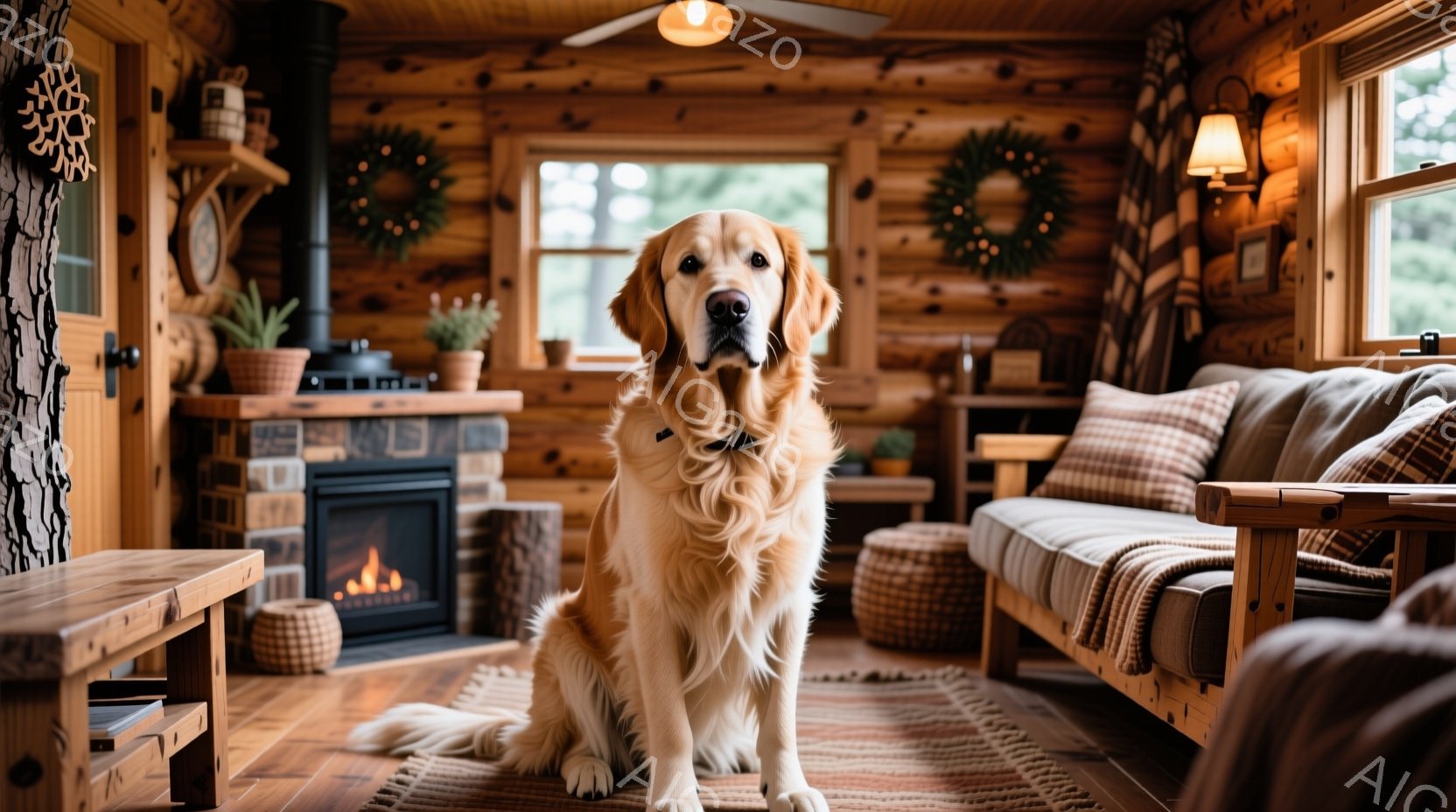 金髪の小さな少年が緑色のセーターと赤い靴下を履いて床に座っており、手に赤いマグカップを持っています。隣には横たわるゴールデンレトリバーがおり、少年の方を見て穏やかな表情をしています。背景にはクリスマスツリーとプレゼントボックスが飾られ、暖かく心地よいホリデシーズンの一コマが捉えられています。