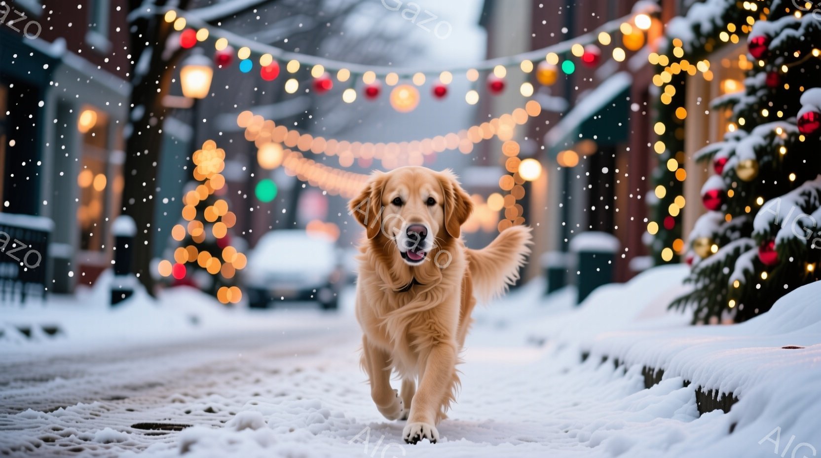 金色の毛並みの犬が雪で覆われた通りを元気に走り去っている。背景にはクリスマスツリーや電飾が輝き、冬の暖かい祝祭の雰囲気を醸し出している。雪が舞い降りており、全体的に穏やかで心地よい印象を与える。