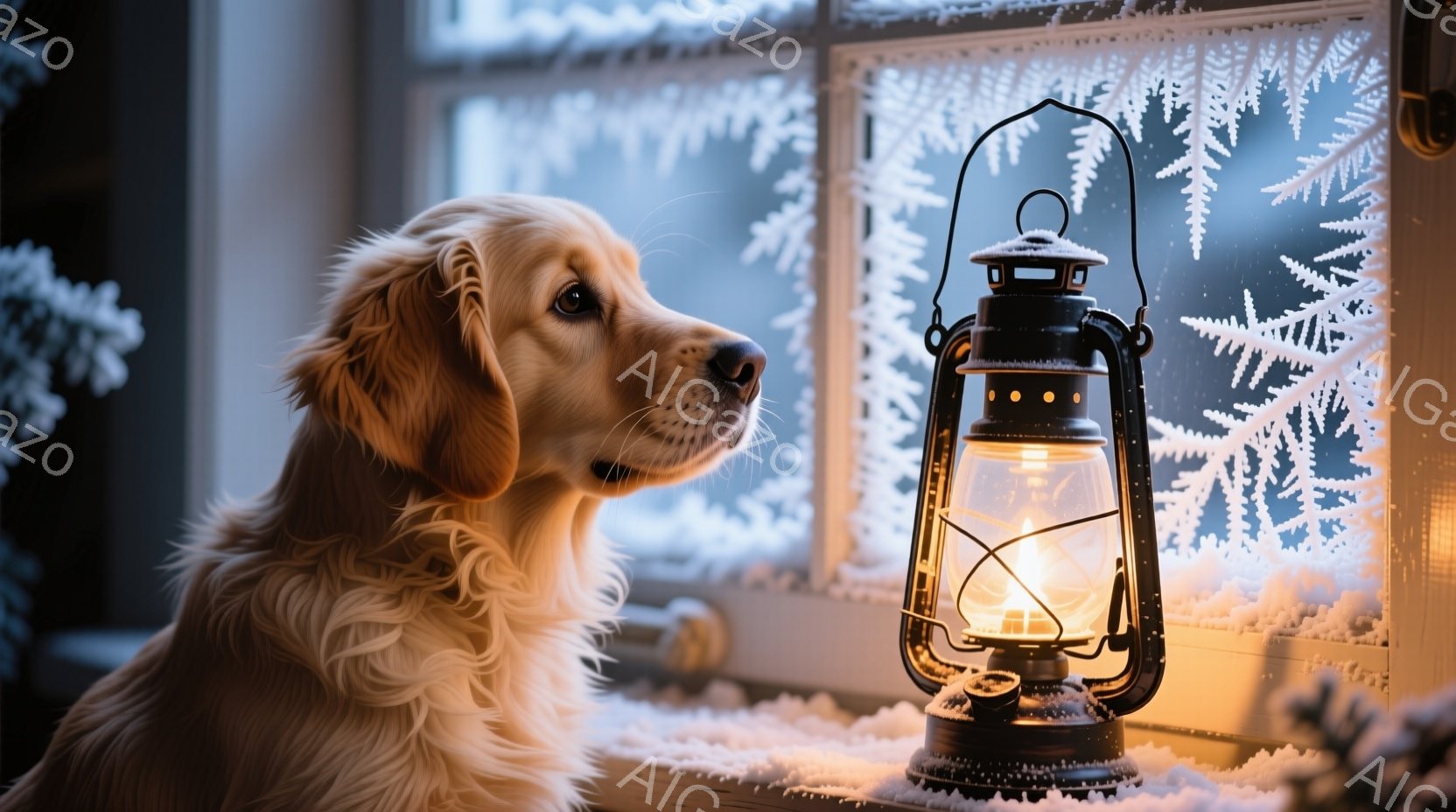 窓辺に置かれたオイルランプが暖かく光り、その隣には優しい表情で外を眺めるゴールデンレトリバーがいます。犬は首輪をつけており、雪が積もった窓の外にはぼんやりとクリスマスツリーが見えます。全体的に暖かく、静かで、冬の穏やかな雰囲気が漂っています。