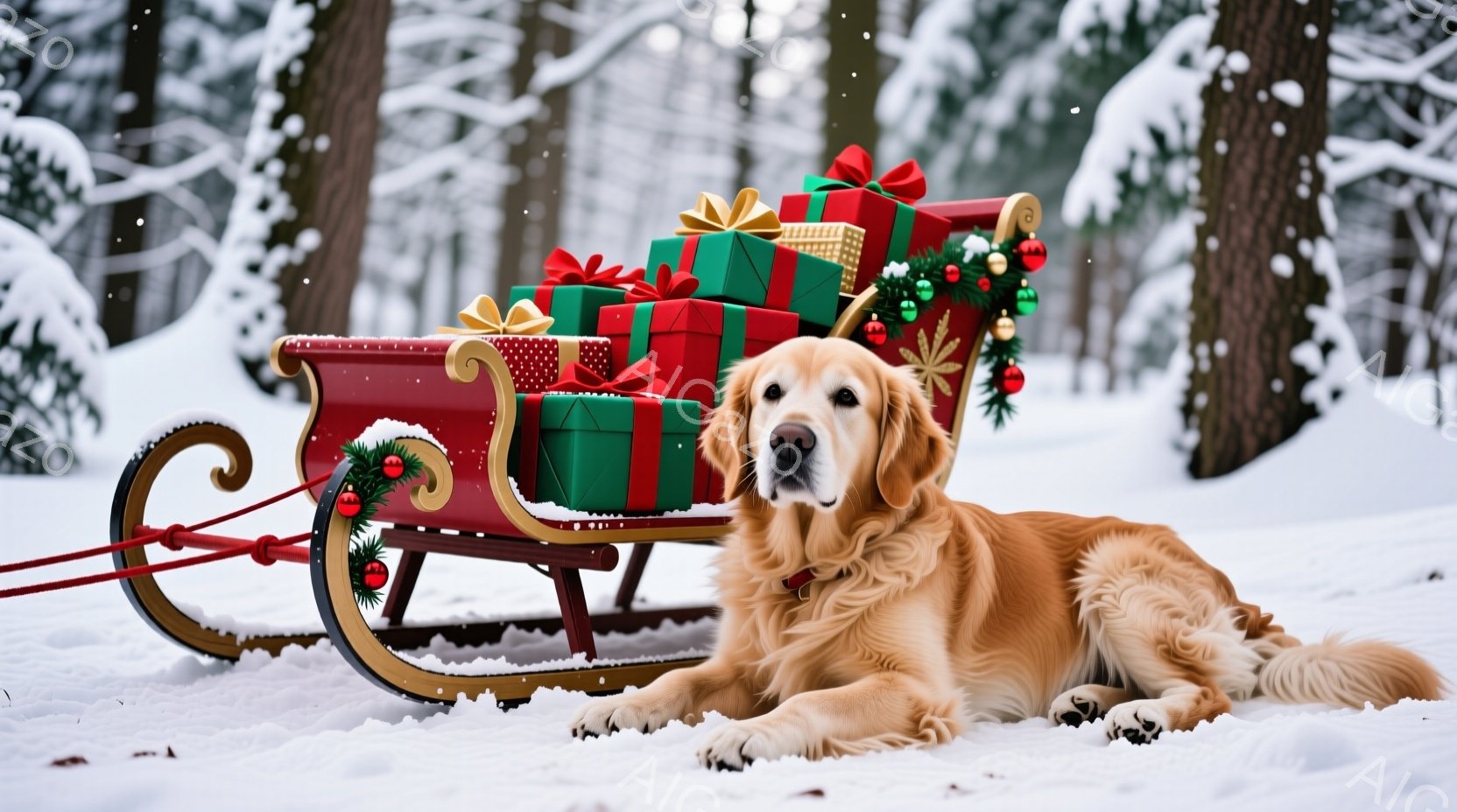 黄金色のレトリバーが木の床に横たわっており、リラックスした表情でカメラを見つめています。背景には、赤いリボンと装飾が施されたクリスマスツリーがあり、プレゼントの箱もわずかに見えます。全体的に、暖かく、平和で、祝祭的な雰囲気が漂っています。