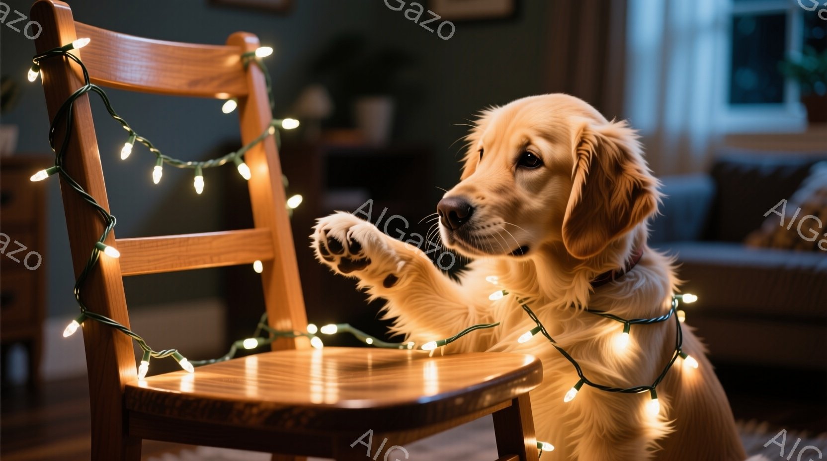 ゴールデンレトリバーが椅子に寄りかかり、カラフルな電飾を前足で遊んでいます。室内は暖色系の照明で照らされ、背景にはぼやけた家具が見え、居心地の良い雰囲気です。犬はリラックスした表情で、穏やかで幸せな瞬間が捉えられています。
