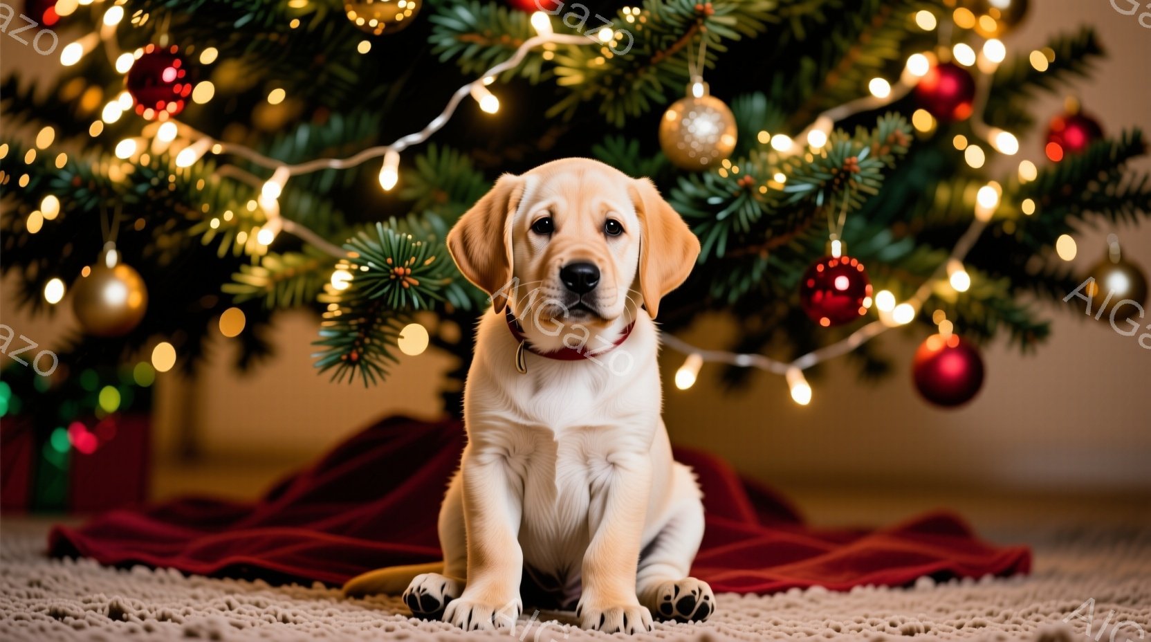 暖炉の前に座っている子犬が写っています。子犬は明るいクリーム色で、まっすぐ前を見ており、穏やかな表情をしています。背景には、装飾されたクリスマスツリーと赤い布があり、温かく、お祝いの雰囲気を醸し出しています。