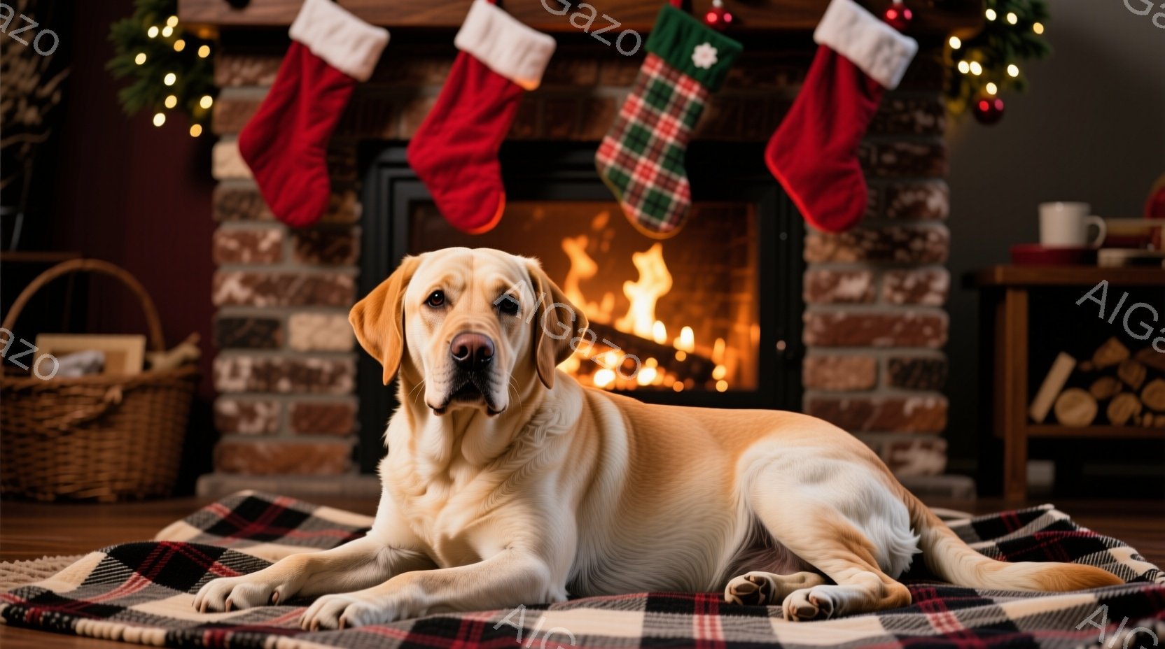 クリーム色のラブラドール・レトリバーが、赤と黒のチェック柄のブランケットの上に横たわっています。暖炉が背景にあり、炎が暖かく輝き、クリスマスらしい赤い靴下が暖炉の上に飾られています。全体的に、暖かく居心地の良い、ホリデーシーズンらしい雰囲気が漂っています。