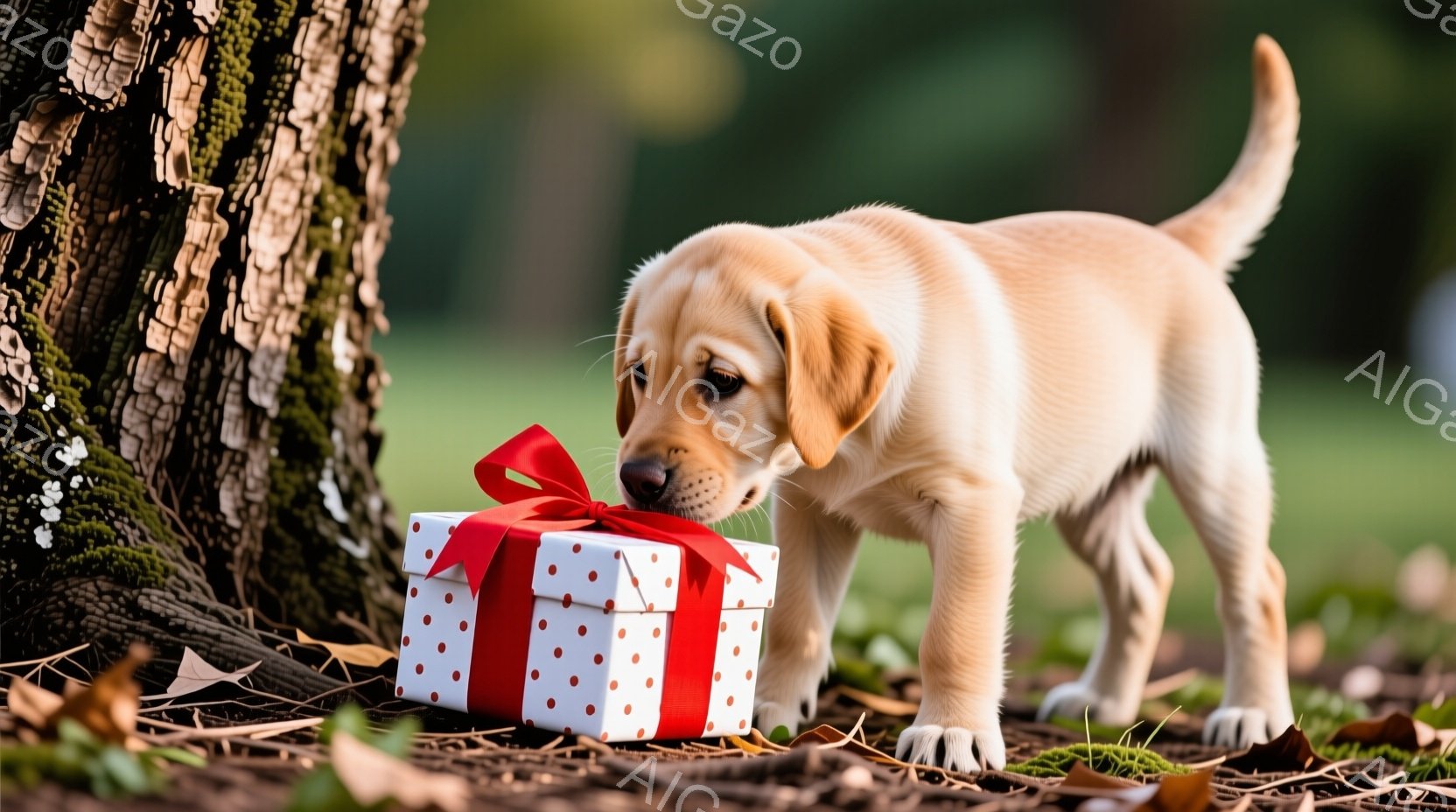 明るいクリーム色のラブラドールの子犬が、赤い水玉模様のリボンで結ばれたプレゼントボックスの前に鼻を近づけています。子犬は少し身をかがめ、興味津々な表情で箱を匂っているようです。背景には木の幹が見え、落ち葉が敷き詰められた地面が広がり、穏やかで優しい雰囲気を醸し出しています。