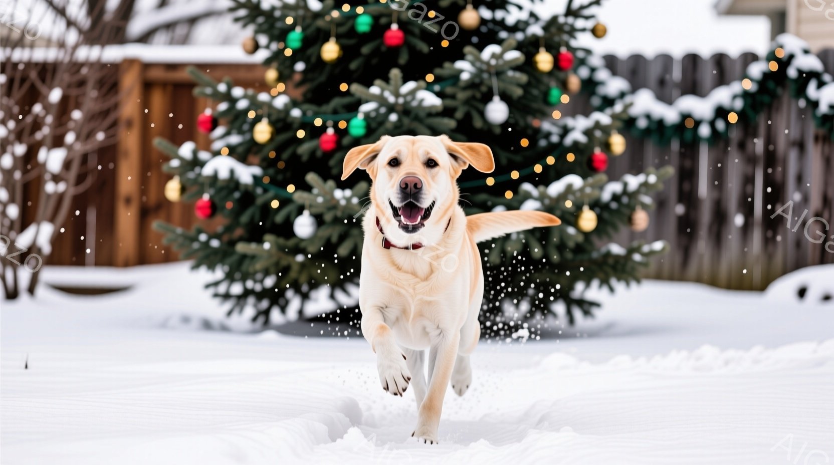 白いラブラドールレトリバーが、雪で覆われた家のステップに座っています。背景には、クリスマスリースが飾られた深い青色のドアと、点灯されたランタンがあり、暖かく穏やかな雰囲気を醸し出しています。雪景色と温かい光が、ホリデーシーズンの静けさと安らぎを感じさせます。