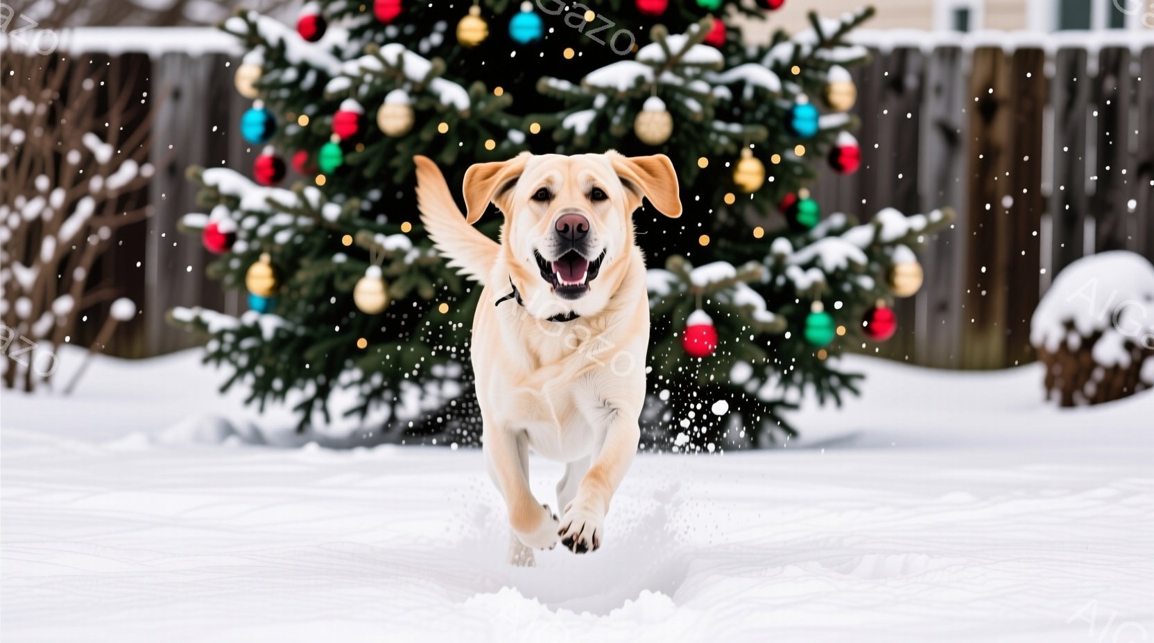 白い雪景色の中で、明るいクリーム色のラブラドール・レトリバーが、雪の中を駆け抜けている。背景には、赤、緑、金色のオーナメントで飾られた大きなクリスマスツリーがあり、雪が降り積もった木製の柵が見える。全体的に、雪とクリスマスツリーが作り出す、暖かく、活気のある冬の雰囲気が漂っている。