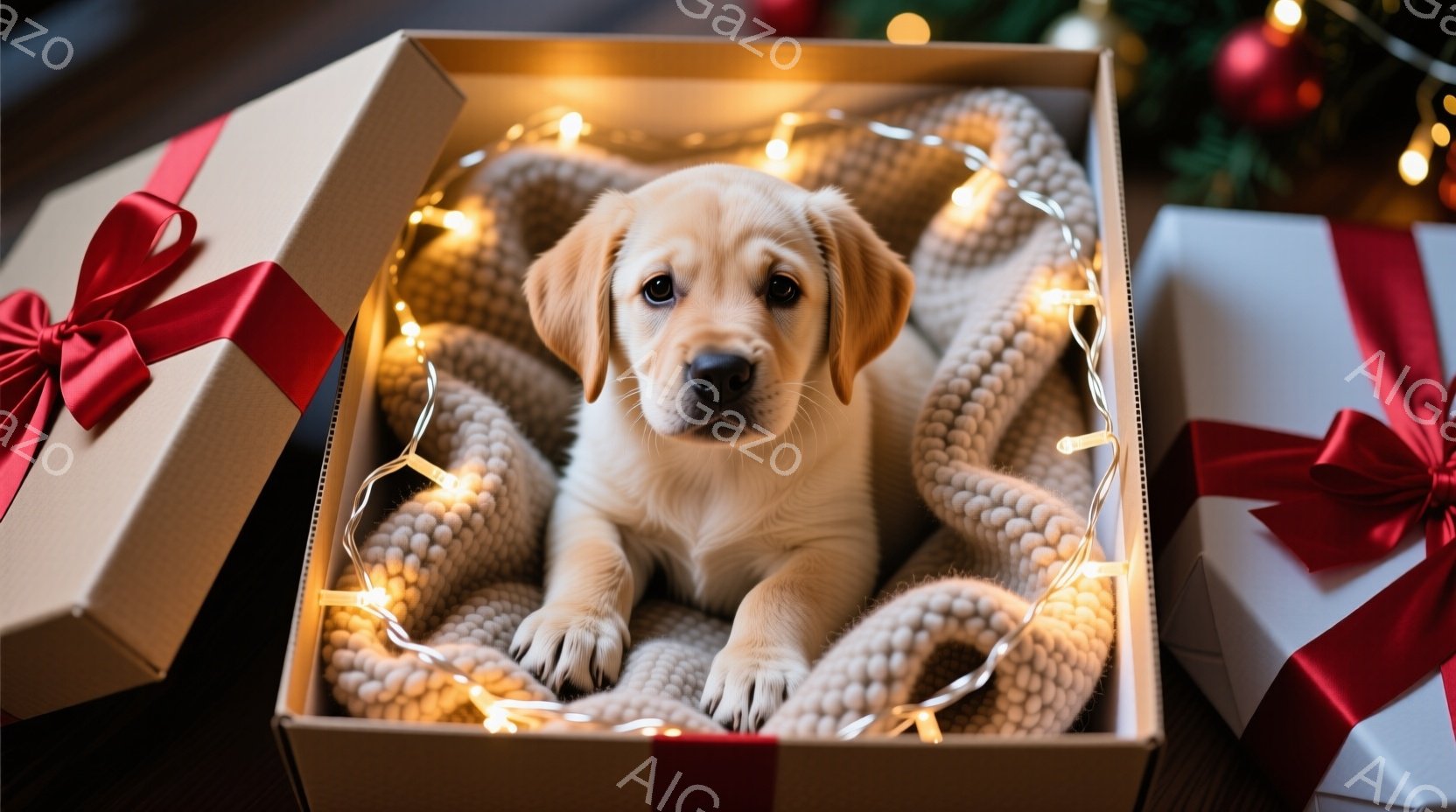 柔らかいクリーム色の毛並みの子犬が、フワフワの毛布の中に座ってこちらを見ています。子犬の周りにはキラキラと光る電飾が巻き付けられ、その周りを白いリボンで飾られたギフトボックスが囲んでいます。全体的に暖かく、お祝いの雰囲気で、クリスマスのプレゼントを連想させる可愛らしい光景です。
