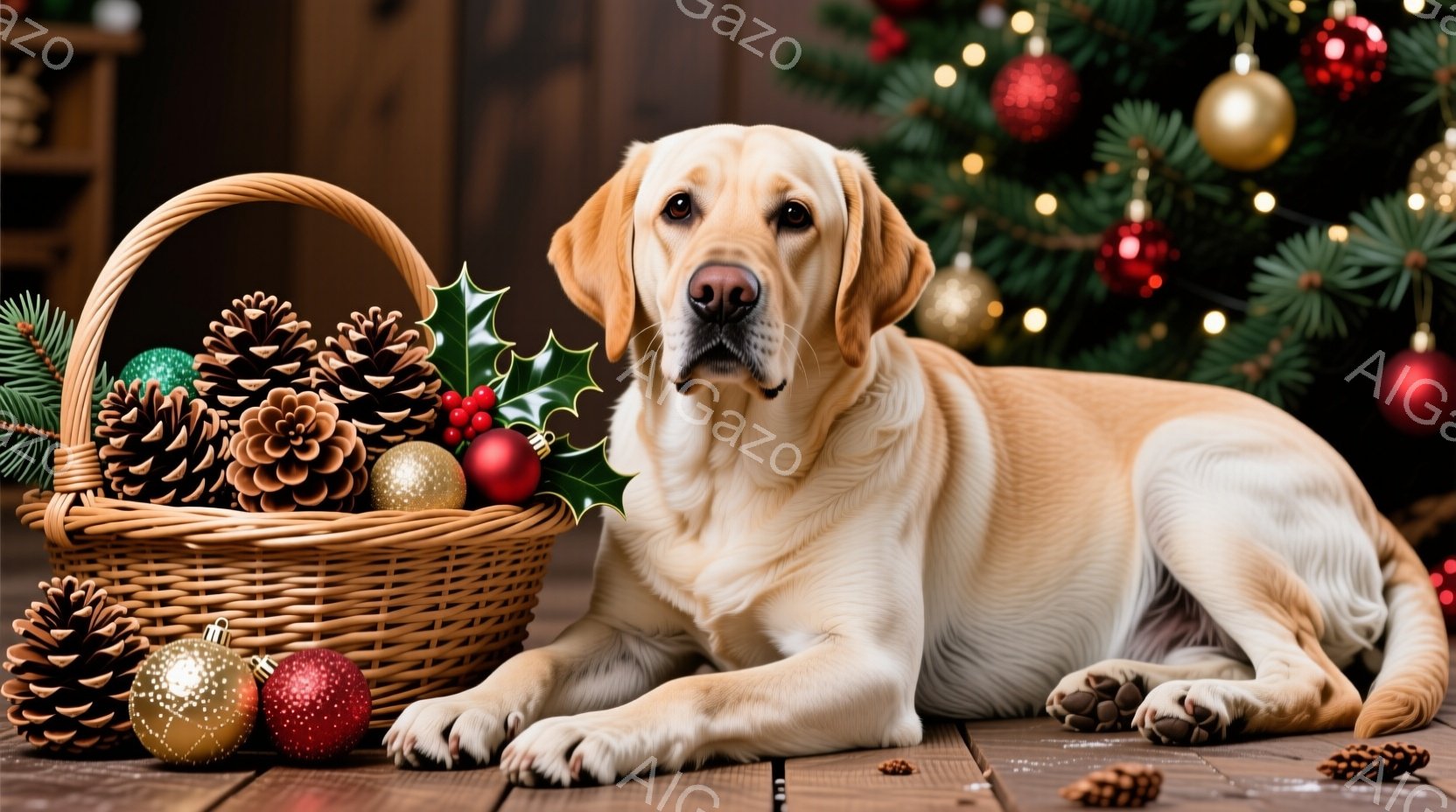 広場の中央には、首輪をつけたクリーム色のラブラドール・レトリバーが座っており、まっすぐカメラを見つめています。背景には、色とりどりのライトで飾られた巨大なクリスマスツリーがあり、雪が舞う冬の夜を表しています。周辺には、暖かい光を放つ建物が並び、静かで温かい祝祭の雰囲気が漂っています。