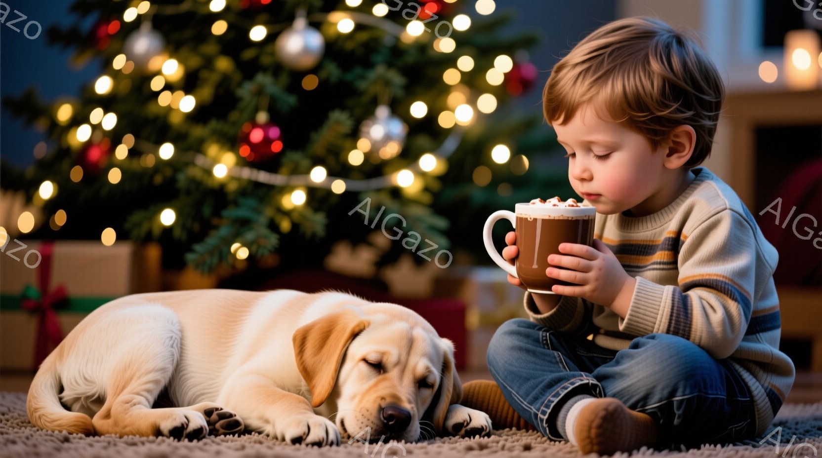 暖炉のそばのカーペットの上に、金髪の少年が座って、ストローで飲み物を飲んでいます。少年は赤いセーターとジーンズを着ており、微笑みを浮かべています。背景には、クリスマスツリーとプレゼントの箱があり、温かく穏やかなクリスマスの雰囲気が漂っています。