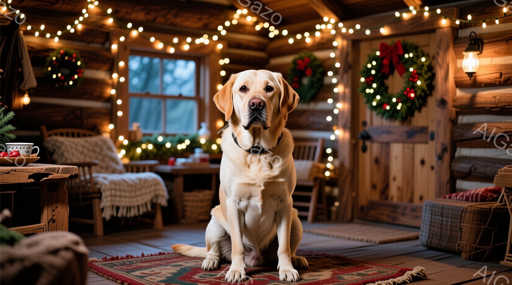 温かみのある丸太小屋の中に、クリーム色のラブラドール・レトリバーが座っています。背景にはクリスマスリースやキャンドルが飾られ、暖かい光が室内を照らしています。赤い柄の絨毯や、クリスマスの飾り付けが、冬の穏やかな雰囲気を醸し出しています。