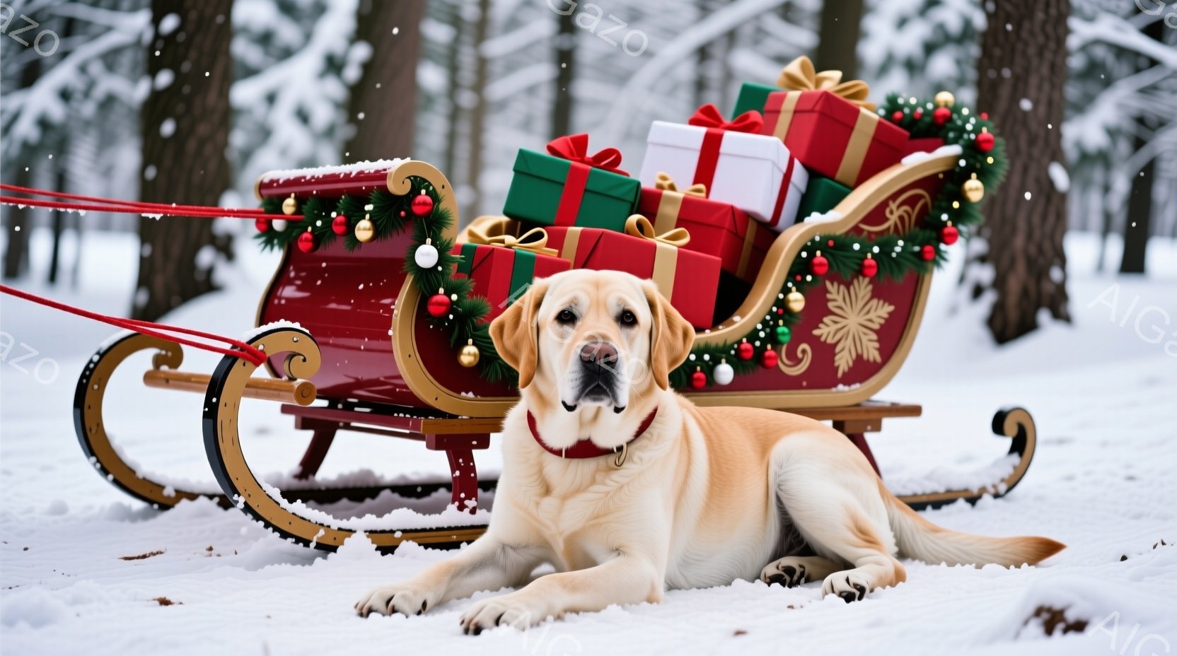 白い毛並みのラブラドール・レトリバーが、雪の上に横たわっています。背景には、プレゼントでいっぱいの赤いそりが置かれており、緑のガーランドと赤い実で飾られています。雪が降り積もる冬の森を背景に、温かく、お祝いの雰囲気を感じさせます。
