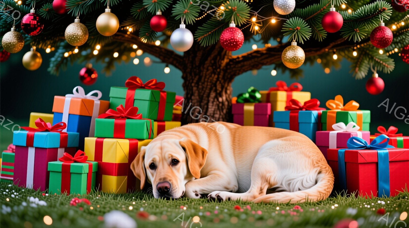 暖炉のそばに積み上げられたプレゼントの山に、クリーム色のラブラドール・レトリバーが横たわっています。犬は落ち着いた表情で、リラックスした様子で床に体を預けています。背景には、飾り付けられたクリスマスツリーがあり、暖かく穏やかな祝祭の雰囲気を醸し出しています。