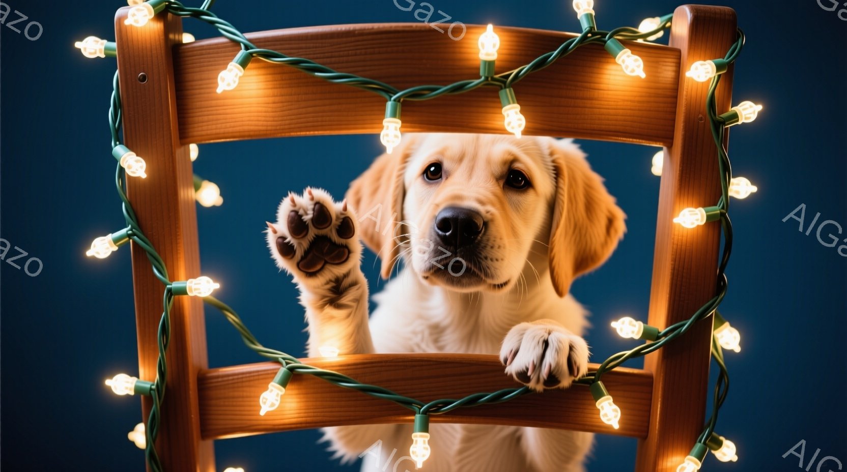 明るいクリーム色の毛並みの子犬が、木の椅子から前足を伸ばしてこちらを見つめています。椅子には小さな電飾が巻き付けられ、温かく楽しい雰囲気を醸し出しています。背景は暗く、子犬と電飾が際立っており、可愛らしい瞬間が捉えられています。