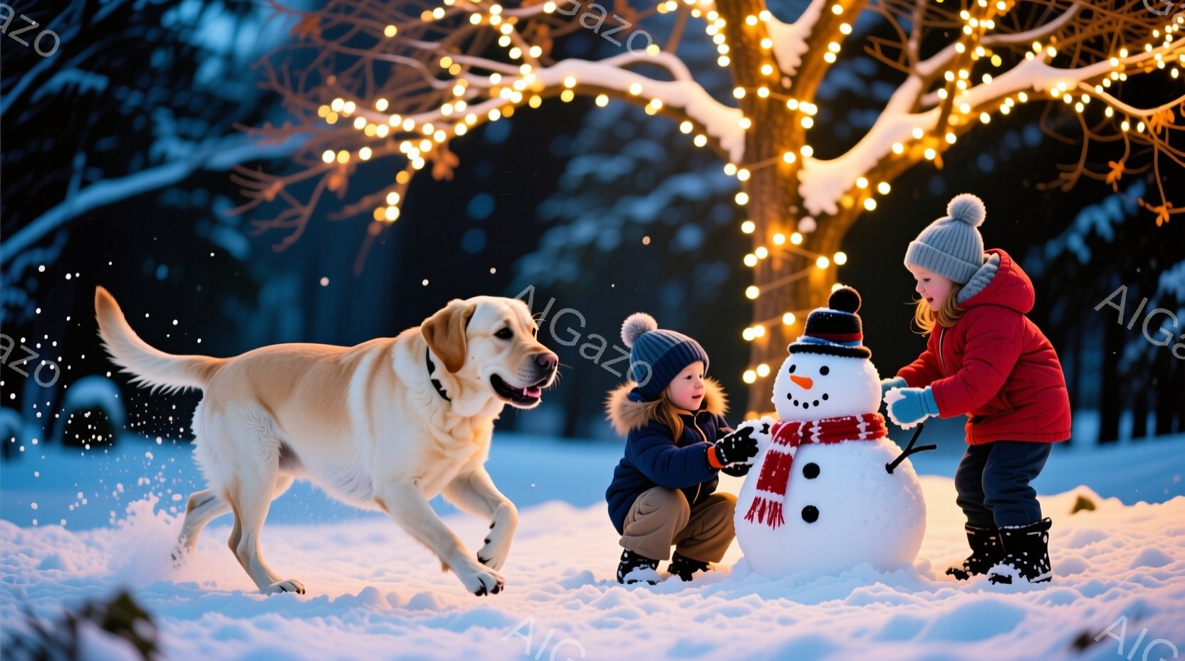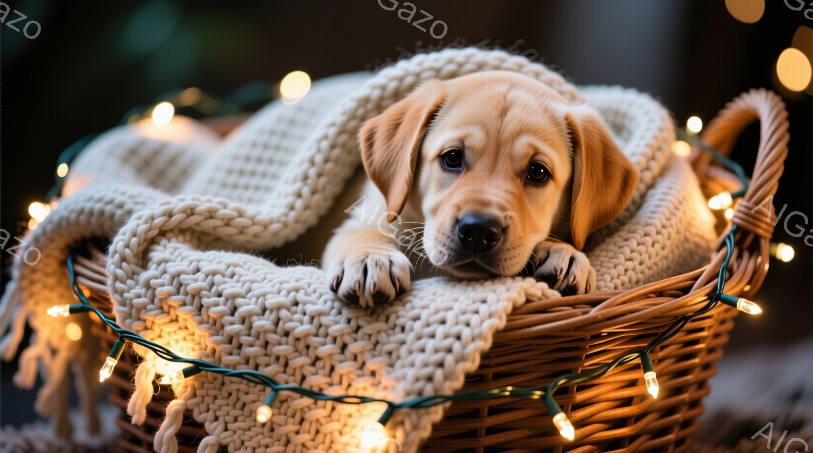柔らかいクリーム色のニットブランケットに包まれた小さなゴールデンレトリバーの子犬が、籐のバスケットの中で丸まって眠っている。子犬は少し眠たげな表情で、暗めの背景に暖色のクリスマスライトがぼんやりと光っている。全体的に、温かく、心地よく、穏やかな雰囲気が漂っている。
