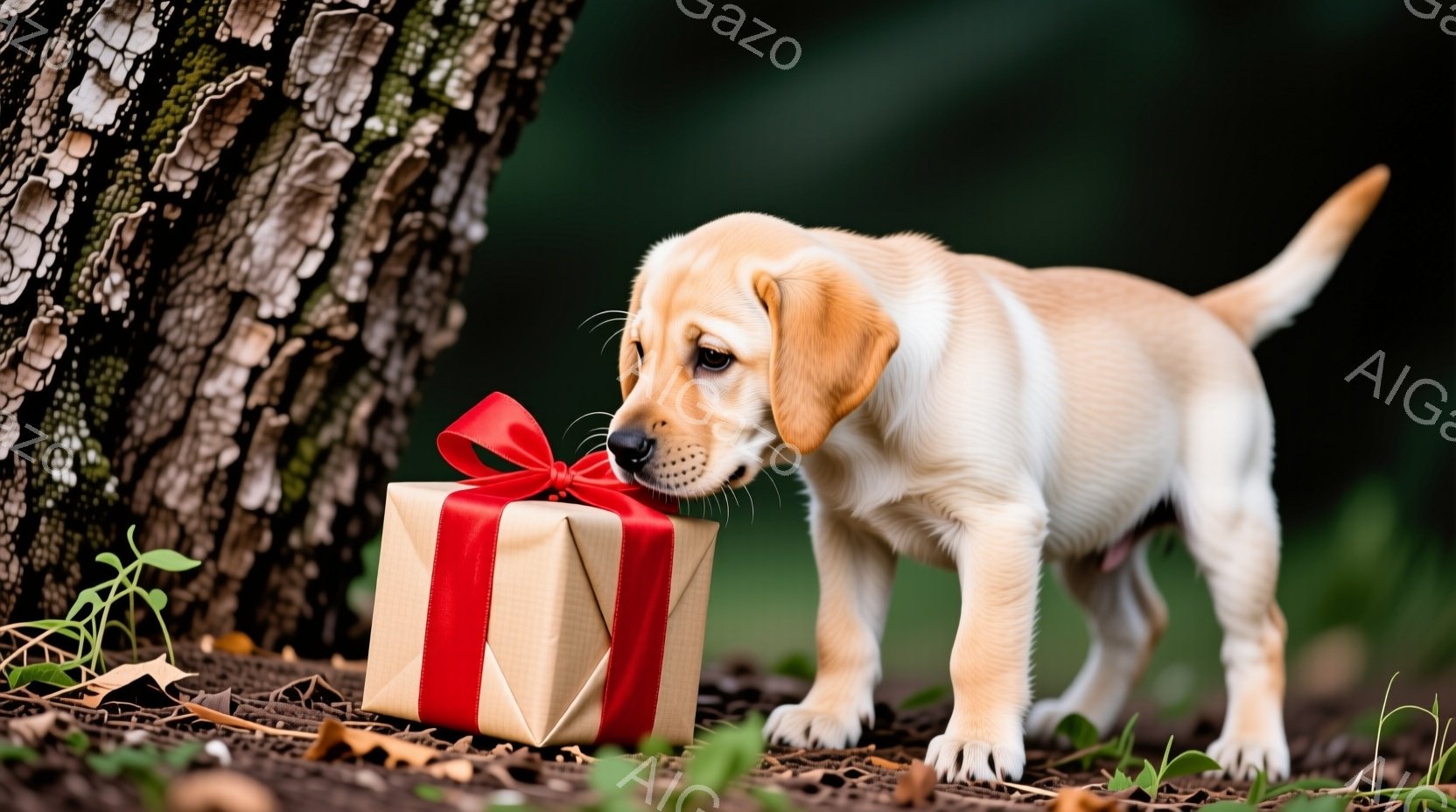金色の毛並みを持つ子犬が、プレゼントの箱の前に立っている。箱は薄茶色の包装紙で包まれ、鮮やかな赤いリボンが結ばれている。背景には緑豊かな芝生と木の幹が見え、暖かく穏やかな雰囲気を醸し出している。