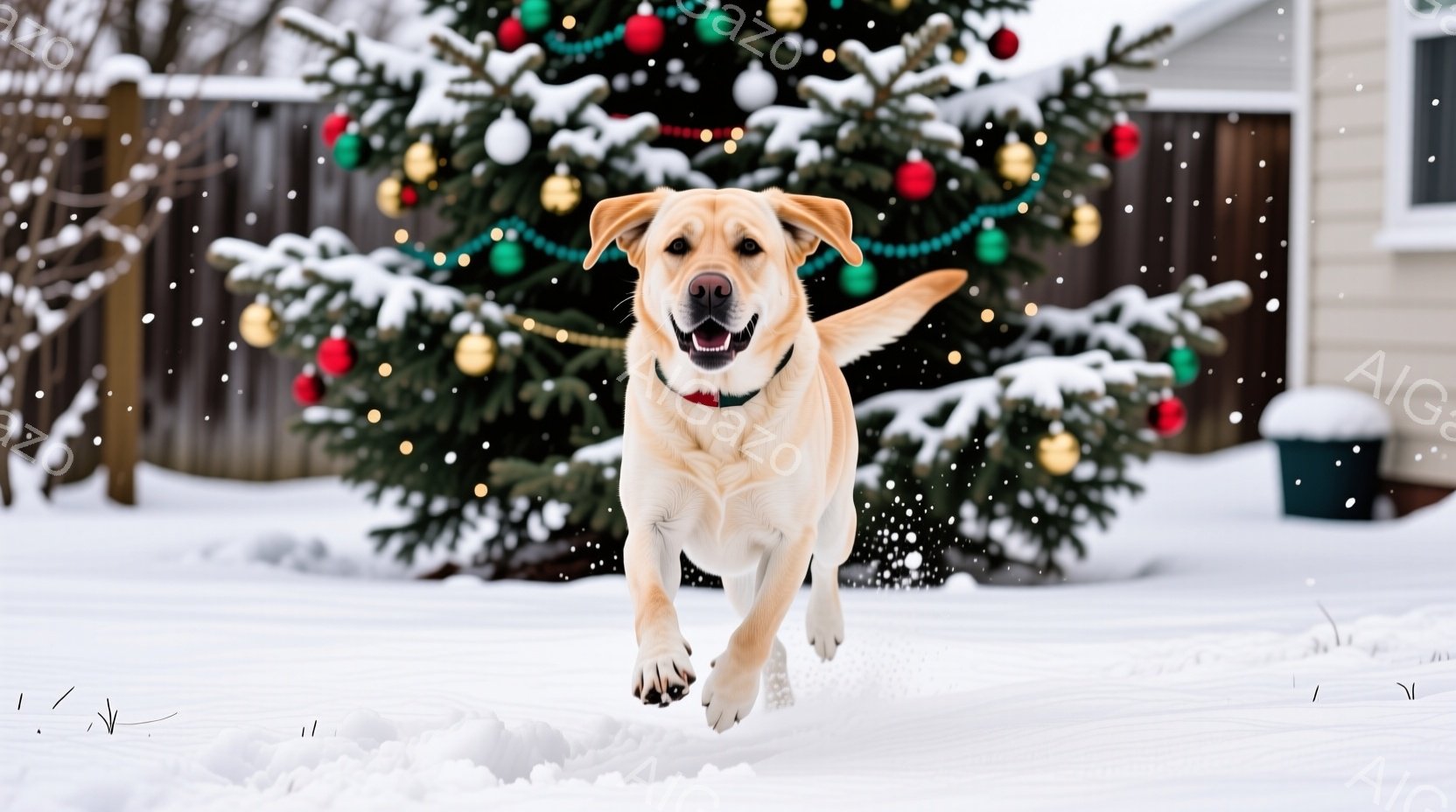 白い雪景色の中で、明るいクリーム色のラブラドール・レトリバーが、雪の上を勢いよく駆け抜けている。背景には、色とりどりのオーナメントで飾られたクリスマスツリーと、雪に覆われたフェンス、そして建物の一部が見える。全体的に、喜びと活気に満ちた、冬の暖かな雰囲気が漂っている。
