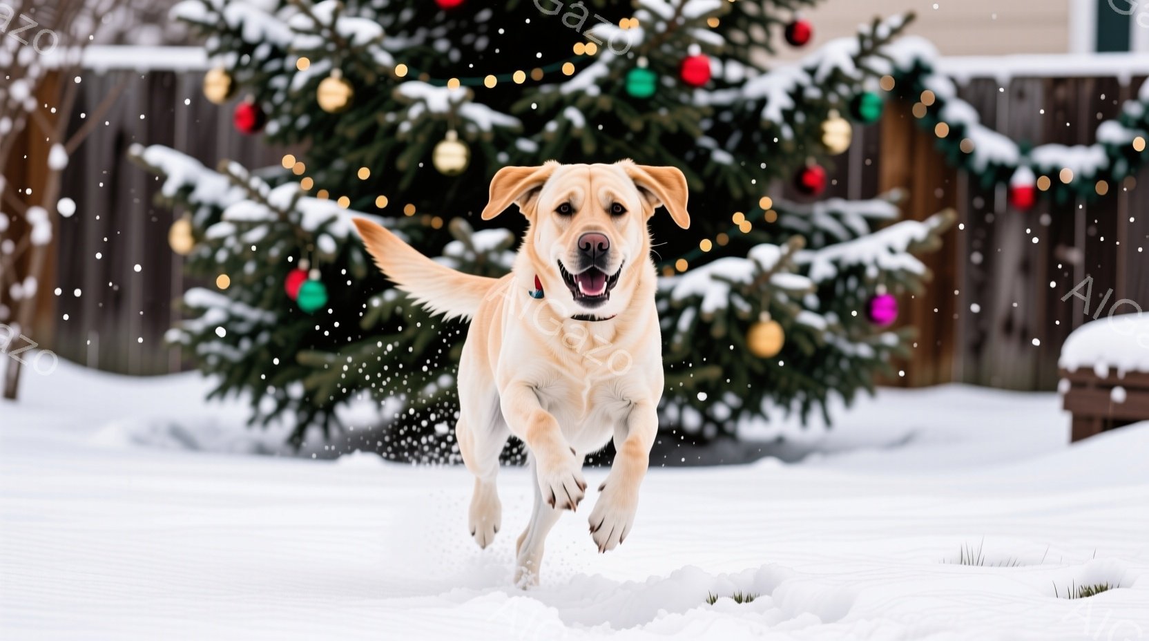 雪景色の中、クリーム色のラブラドールレトリバーが雪の上を勢いよく走っている。背景にはクリスマスツリーが飾られており、赤いオーナメントが緑の葉に映えている。雪が舞い、犬は嬉しそうに口を開けており、冬の喜びと活気に満ちた雰囲気が伝わってくる。