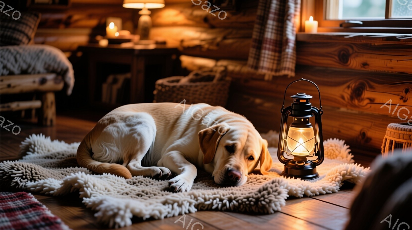 明るい毛並みのラブラドール・レトリバーが、ふわふわのラグの上に横たわってリラックスしています。部屋は木のぬくもりを感じさせる内装で、壁には棚が並び、キャンドルやランプの光が温かい雰囲気を演出しています。窓の外は雪景色で、冬の静寂と安らぎが漂う空間です。