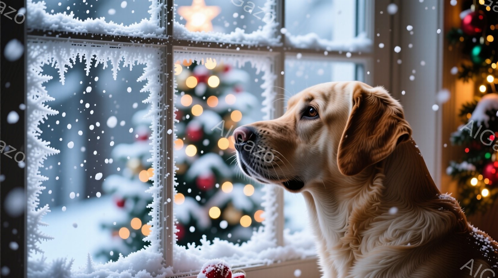 白い毛並みのラブラドール・レトリバーが窓の外をじっと見つめています。窓枠には雪が積もり、背景にはクリスマスツリーの温かい光がぼんやりと見え、冬の穏やかな雰囲気を醸し出しています。犬は赤い首輪をつけており、どこか物憂げな表情で、静かな冬の光景に溶け込んでいます。