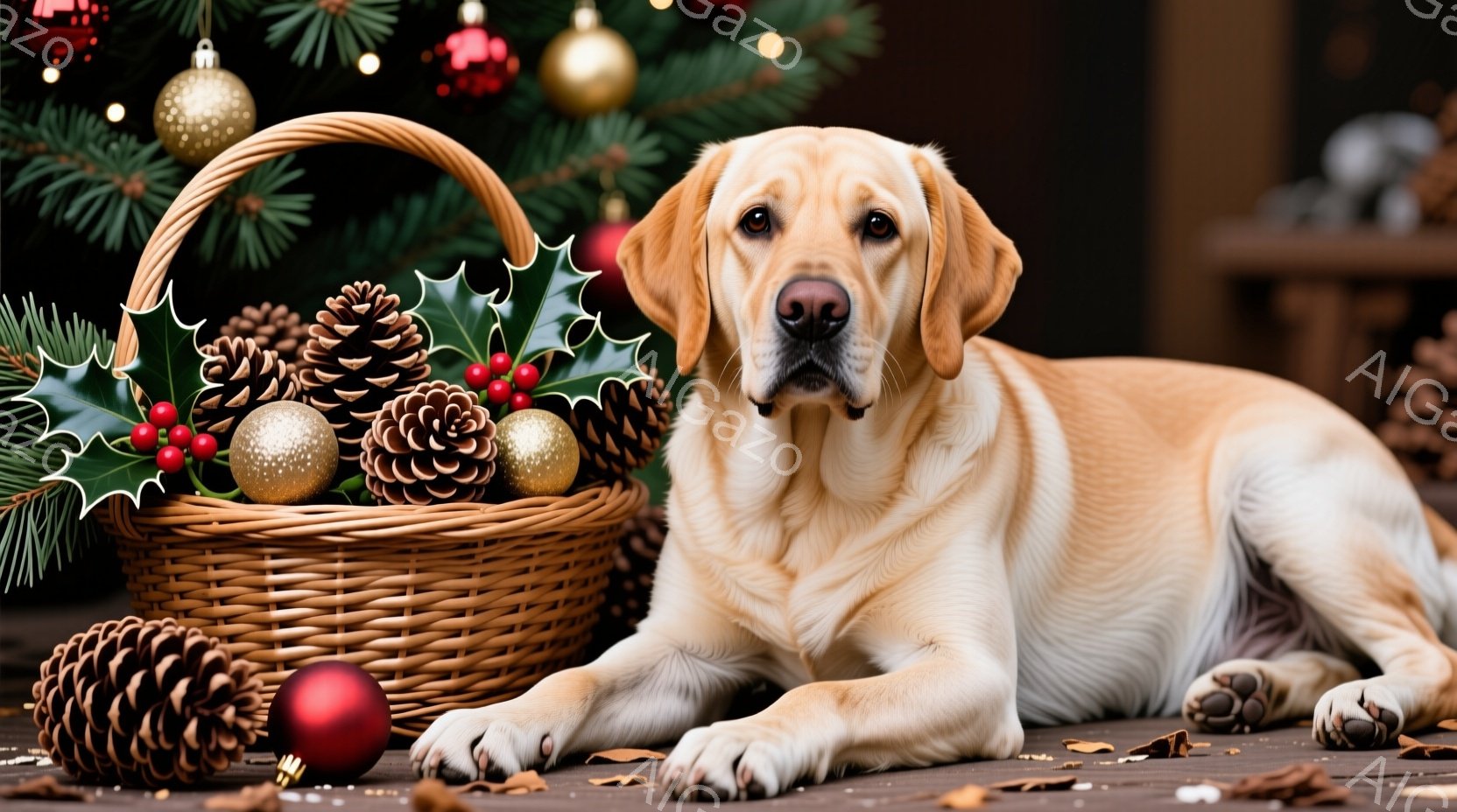 明るい毛並みのラブラドール・レトリバーが、クリスマスの飾り付けられた背景の前で横たわっています。 籠には松ぼっくりや赤いオーナメントが飾られ、地面には落ち葉が散らばっています。 全体的に温かく、穏やかなクリスマスの雰囲気が漂っています。