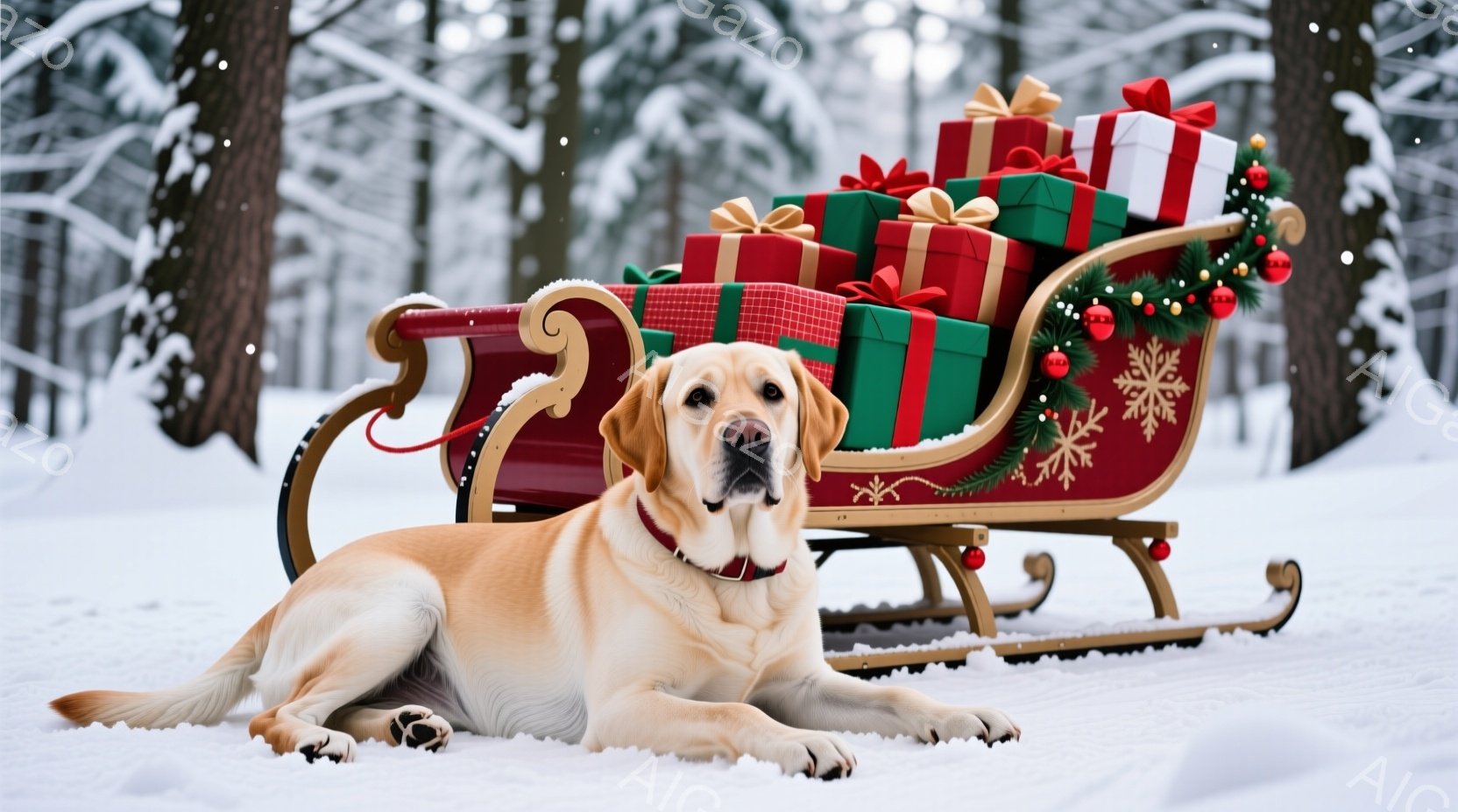 鮮やかな緑色のそりに、赤や金色の包装紙で飾られたプレゼントが山積みにされています。そりの隣には、明るい毛並みのラブラドールレトリバーが横たわり、穏やかな表情でこちらを見ています。背景は雪に覆われた森林で、冬の静けさと温かいクリスマスの雰囲気が漂っています。
