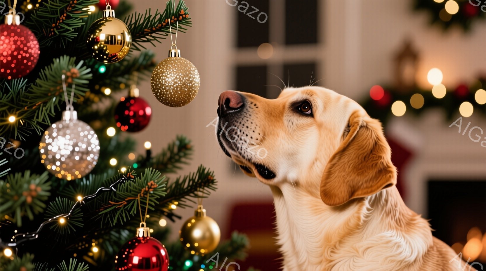 明るい毛並みのゴールデンレトリバーが、クリスマスツリーを見上げている様子が写っている。ツリーには赤や金、銀色のオーナメントが飾られており、背景はぼやけて暖かな光に包まれている。全体的に温かく、穏やかなクリスマスの雰囲気が漂っている。