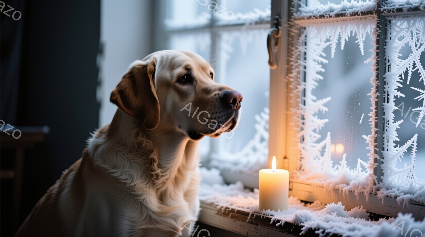 クリーム色のラブラドール・レトリバーが、霜で覆われた窓の外を物憂げに見つめている。窓辺には温かい光を放つキャンドルが置かれ、薄暗い室内を照らしている。外は雪が降り積もり、凍てつくような冬の風景が広がっている。
