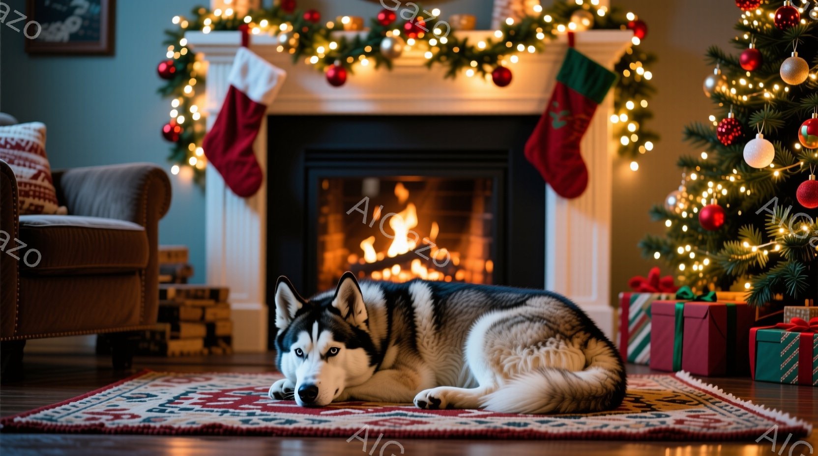 白と黒のシベリアンハスキーが、暖炉の前にある赤い絨毯の上で横たわっています。暖炉には火が灯っており、その上にはクリスマスストッキングが飾られています。背景にはクリスマスツリーとプレゼントの山があり、暖かいクリスマスの雰囲気を醸し出しています。