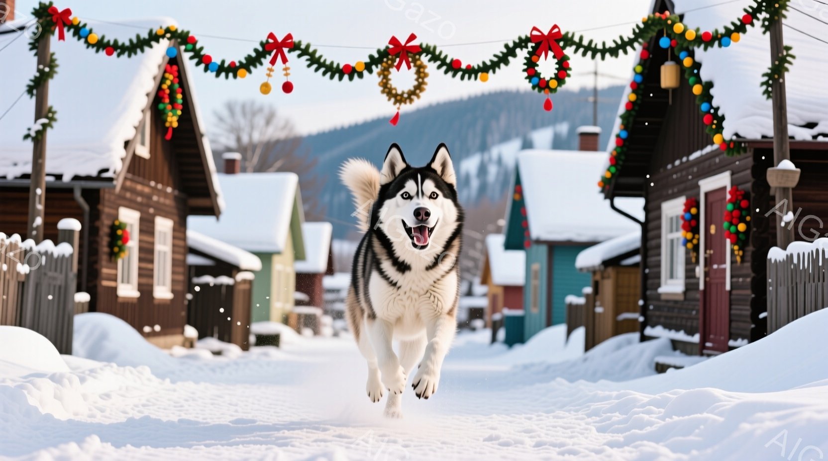 雪に覆われた静かな街並みを、シベリアンハスキーが勢いよく駆け抜けている。背景には木造の家々が連なり、雪景色の中に温かみを与えている。犬は口を開けて楽しそうに走り、その活発な姿が冬の寒さを吹き飛ばすような、陽気な雰囲気を醸し出している。