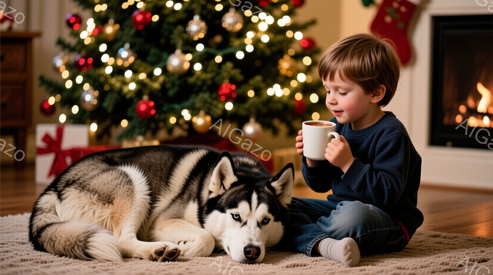 小さな少年が床に座り、赤いマグカップをストローで飲んでいます。そばにはシベリアンハスキーが横たわり、少年を見つめています。背景にはクリスマスツリーが飾られ、暖炉の火が灯り、温かく心地よい雰囲気の室内です。