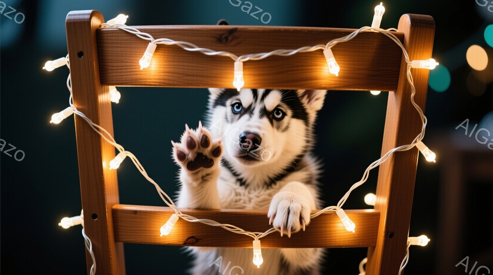 白と黒のハスキーの子犬が木製の椅子の間から片足を伸ばしてこちらを見ています。子犬は興味津々とした表情で、背景にはぼやけた緑色の光が灯ったクリスマスライトが飾られています。全体的に暖かく、遊び心のある雰囲気が漂う、愛らしい一枚です。
