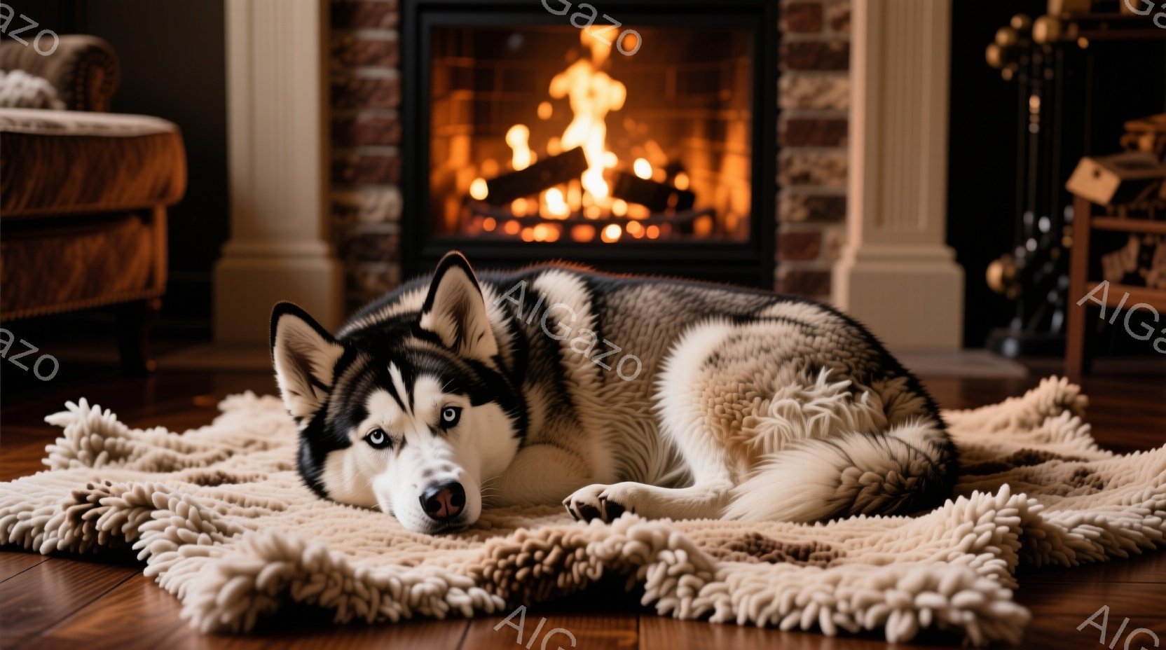 鮮やかな青い目を持つシベリアンハスキーが、ふわふわの白いラグの上に横たわっています。暖炉の炎が背景にあり、暖かい雰囲気を作り出しています。ハスキーはリラックスした表情で、部屋全体が落ち着いた空間を演出しています。