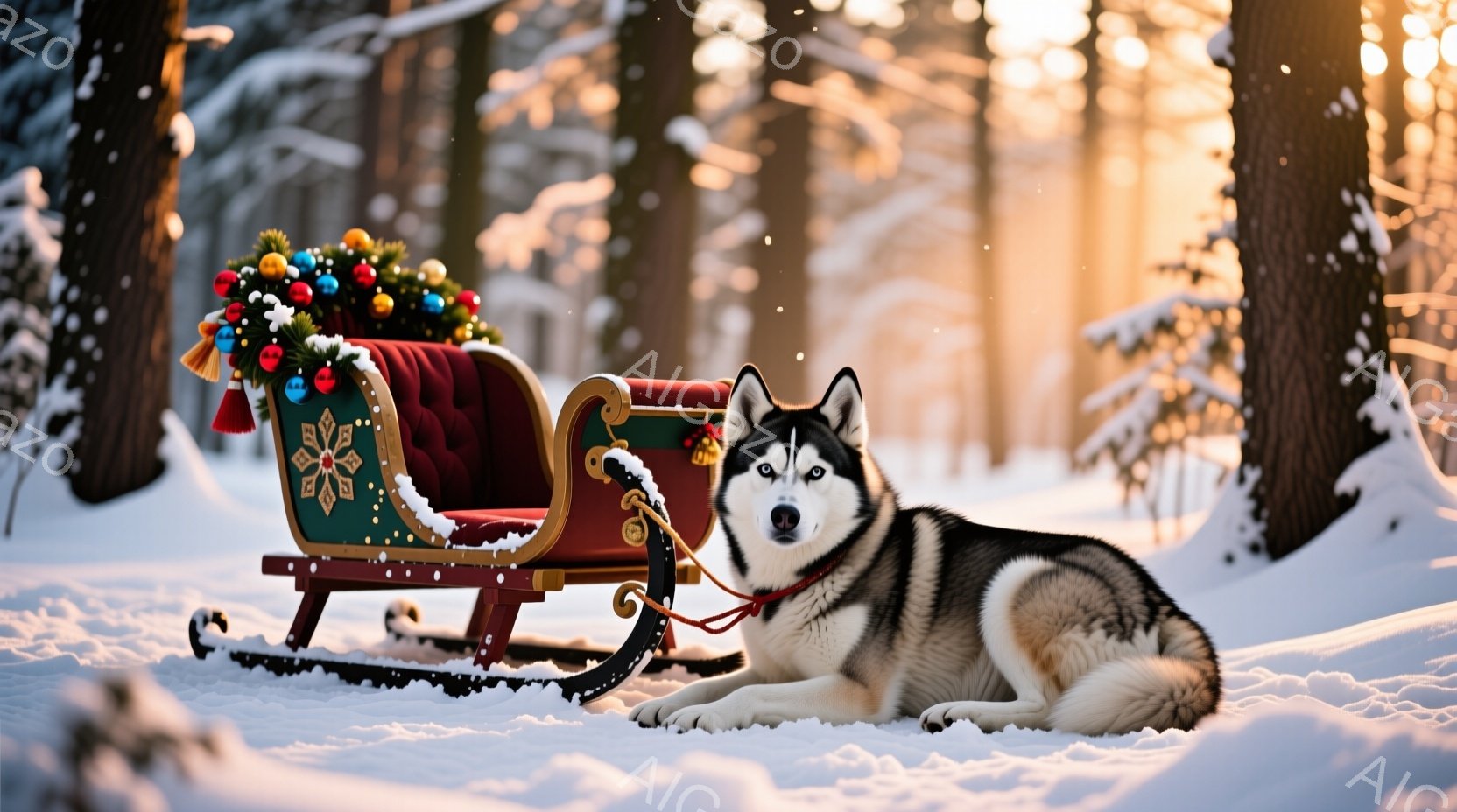 白い雪景色の中に、シベリアンハスキーがリラックスして横たわっています。背景にはクリスマスツリーが輝き、建物や木々が冬の静寂に包まれています。全体的に暖かく、穏やかなクリスマスの雰囲気が漂っています。