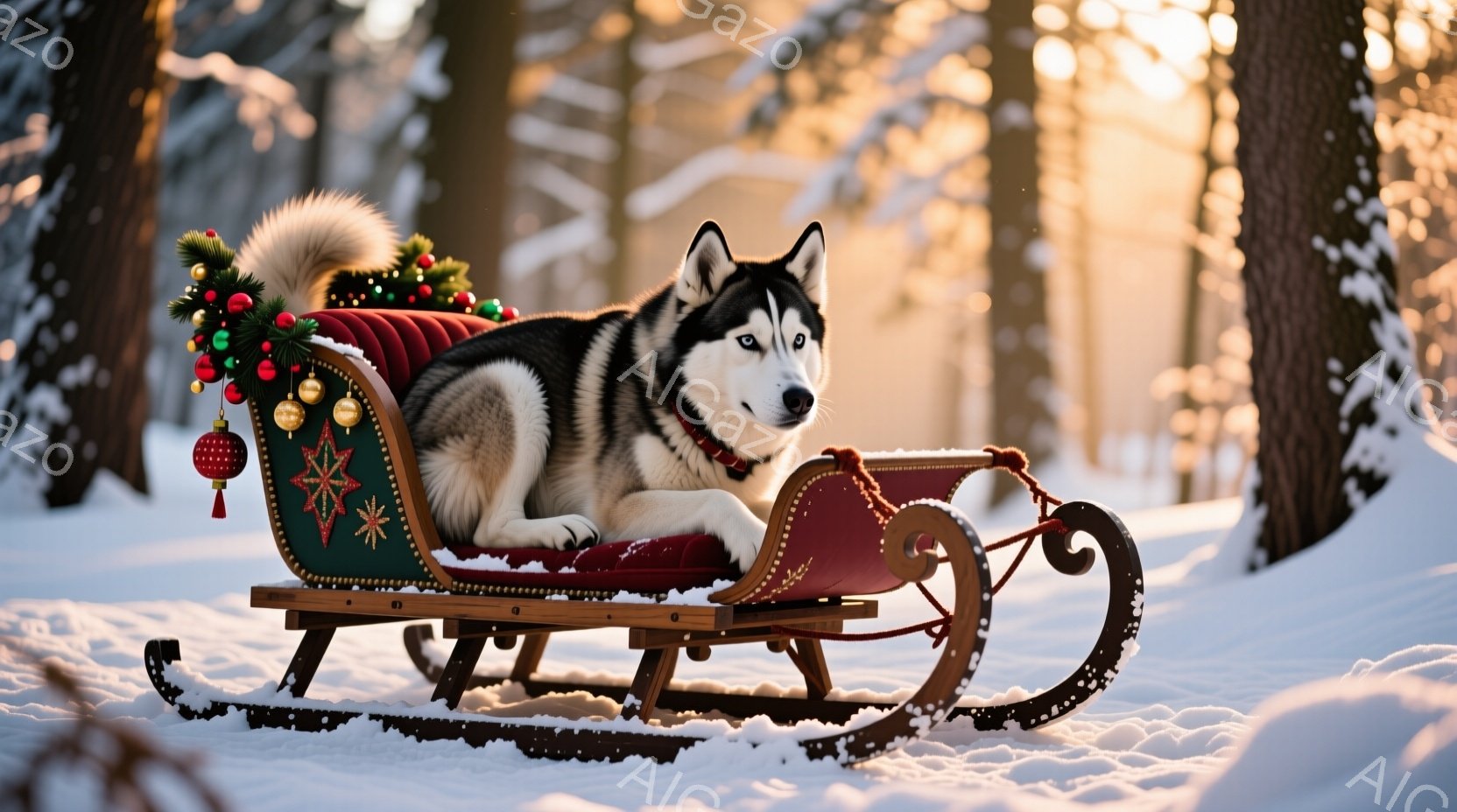 雪景色の中に、赤いそりにシベリアンハスキーが横たわっている。そりはクリスマスオーナメントや松飾りで華やかに飾られており、犬はリラックスした表情で正面を見つめている。背景には雪に覆われた木々が広がり、暖かな光が差し込み、冬の穏やかな雰囲気を醸し出している。