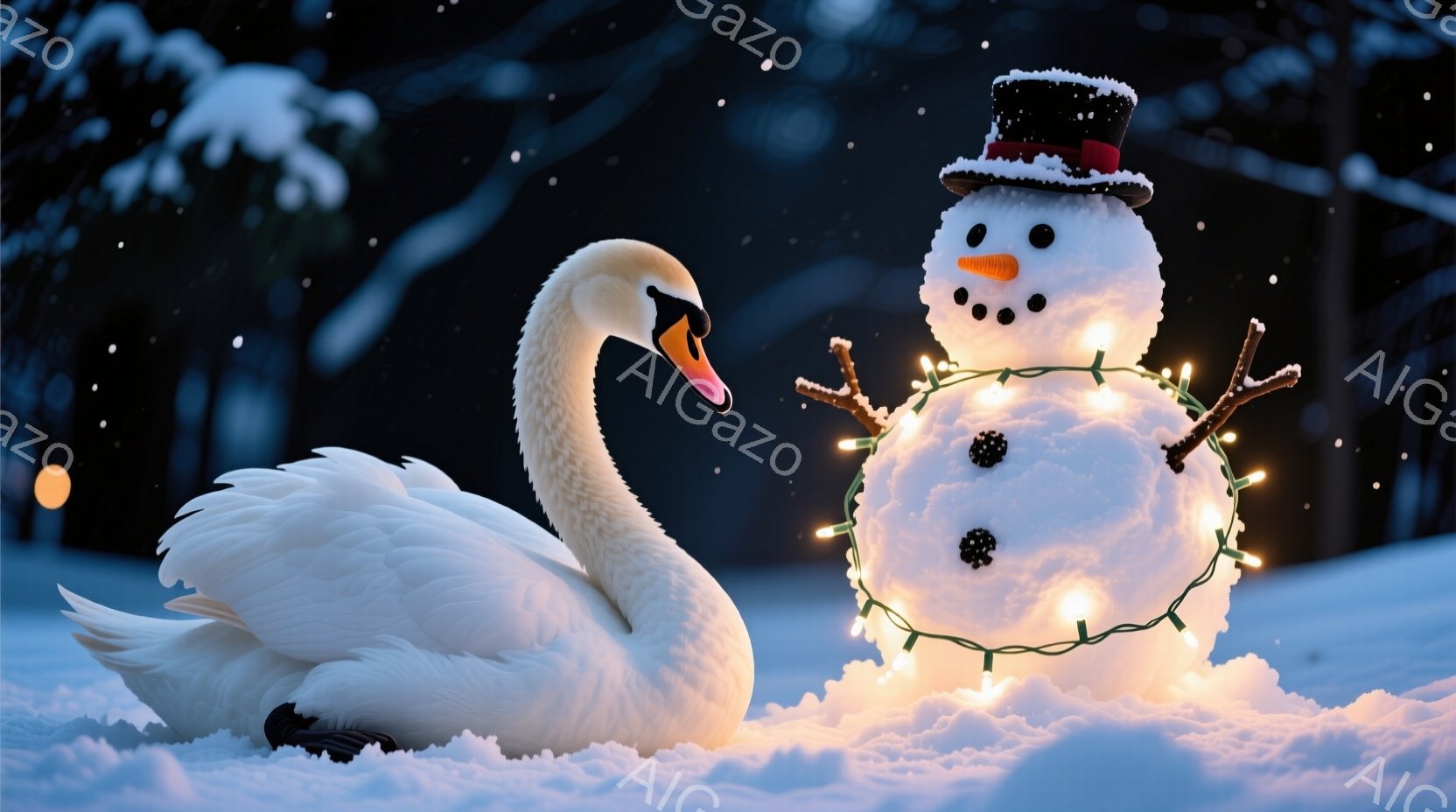 白い大きな鳥、おそらく白鳥が雪の上に座っており、隣には雪だるまが立っています。雪だるまは、丸い鼻と炭で作られた目、そして頭には黒い帽子をかぶっており、暖かい光を放つ電飾で飾られています。背景は暗く、雪がちらつき、暖かく幻想的な冬の雰囲気を作り出しています。