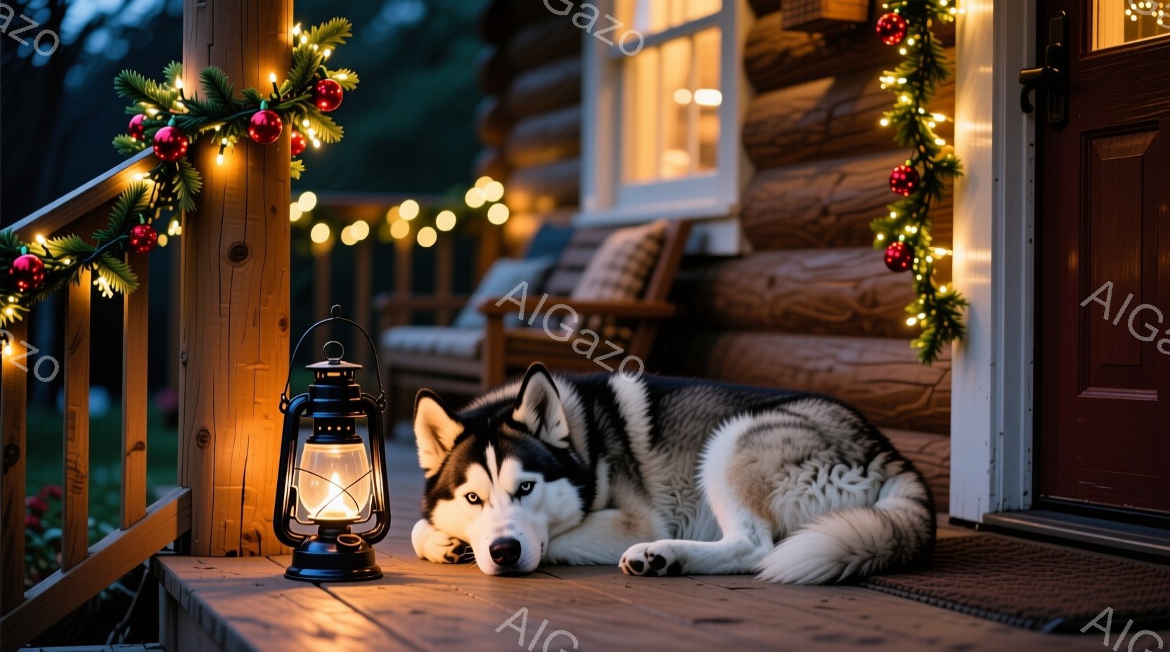 暖炉の光に照らされた木製のベランダに、シベリアンハスキーが横たわっています。クリスマスの飾り付けが施された手すりとドアが背景に見え、温かく穏やかな雰囲気を醸し出しています。ランタンの優しい光が犬を照らし、冬の夜の静けさを感じさせます。