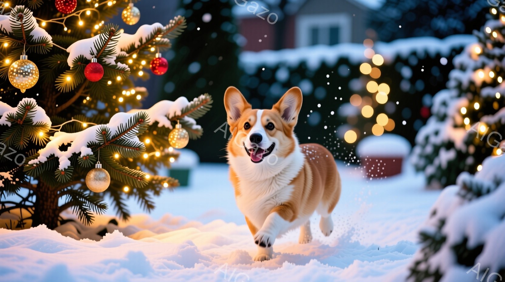 雪が降る庭で、コーギー犬が楽しそうに駆けている姿が捉えられています。背景には、電飾で飾られたクリスマスツリーが並び、雪化粧した緑が冬の温かい雰囲気を醸し出しています。犬は口を開けて笑顔を見せ、雪の中を元気に走り回る様子が、見る人に幸福感を与えます。