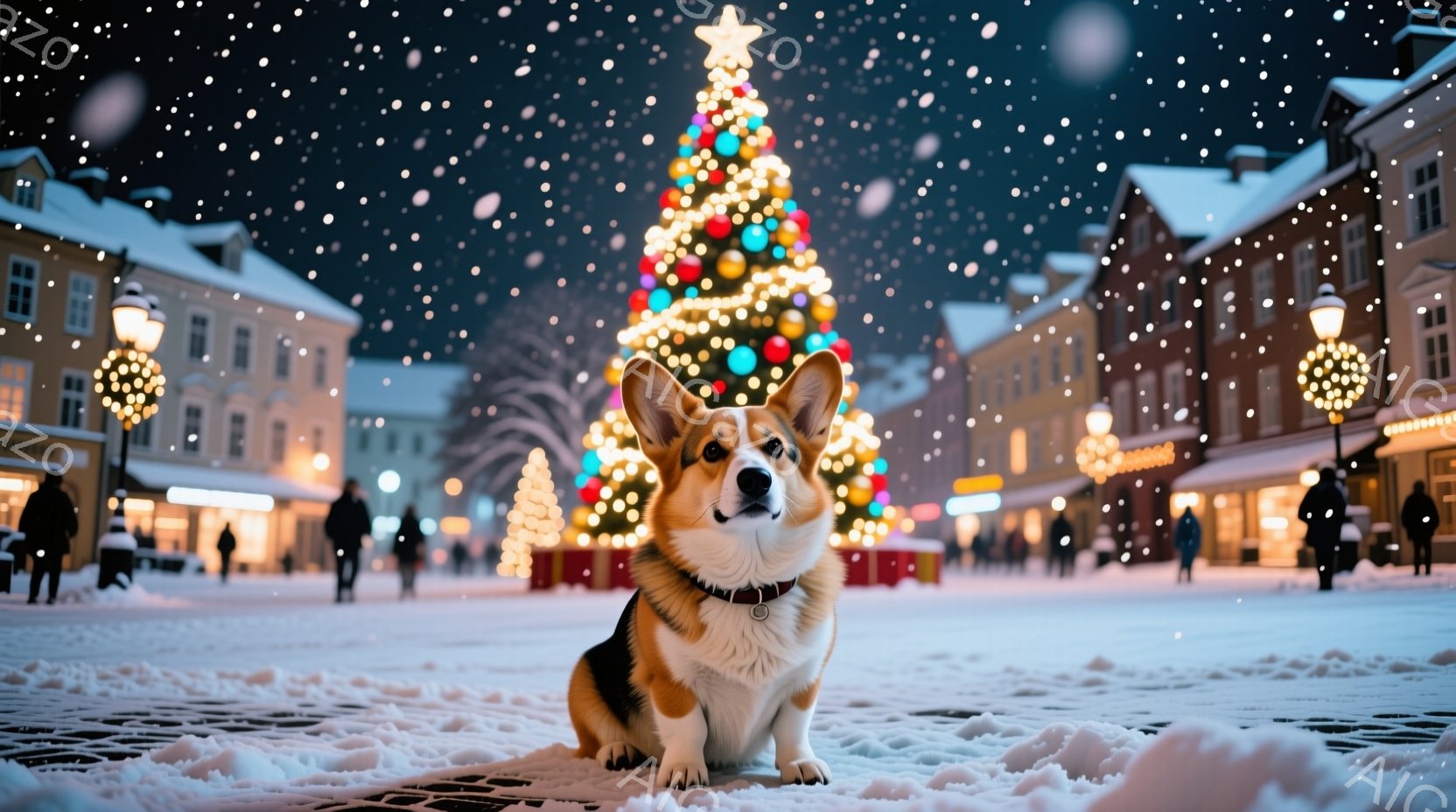 雪が降り積もる夜の街中に、コーギー犬が正面を向いて座っています。背景にはクリスマスツリーが輝き、街路樹や建物が温かい光で飾られています。全体的に穏やかで、祝祭的な雰囲気が漂う冬の光景です。