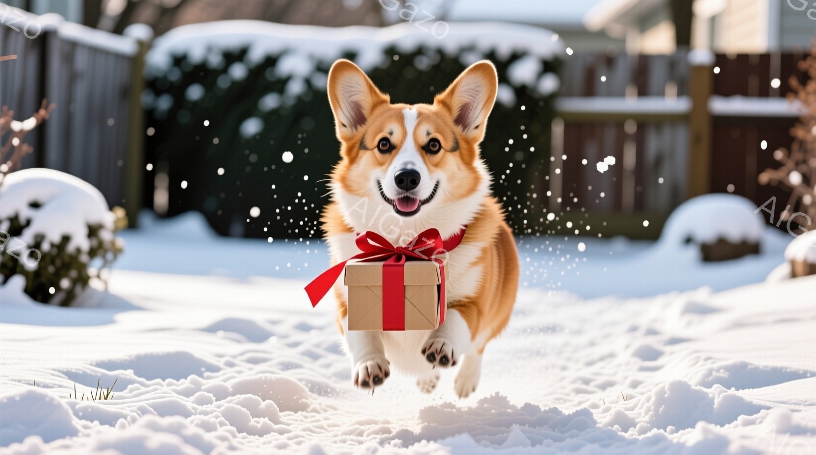 雪が降る庭で、コーギー犬がプレゼントの箱をくわえて走っている姿が写っている。犬は口を開けて嬉しそうに走り、雪の上には足跡が残っている。背景には住宅が見え、冬の穏やかな雰囲気が漂っている。