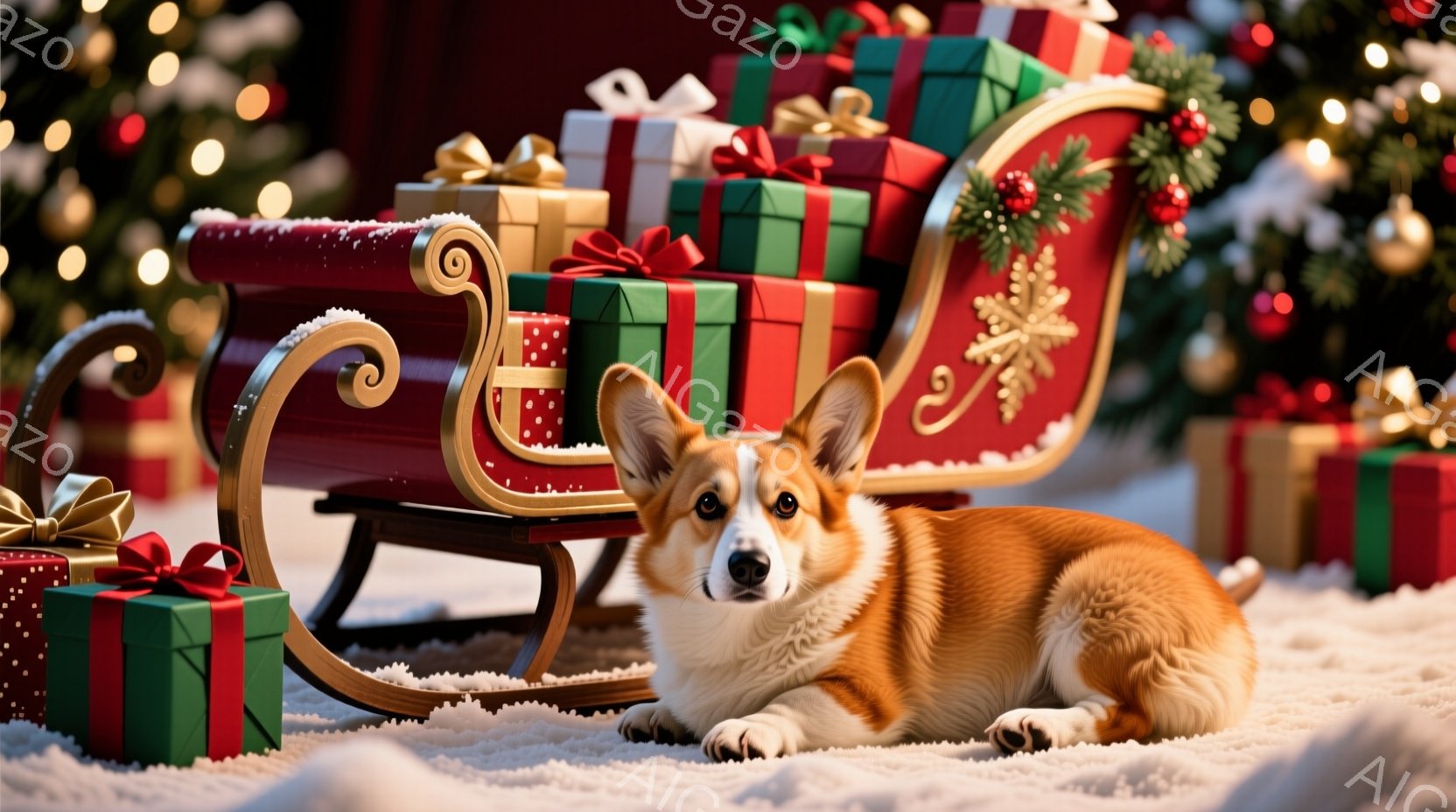 雪景色の中で、コーギー犬がクリスマスの飾り付けられた小さなモミの木を背景に立っている。犬は赤色の首輪をつけ、正面を見ており、穏やかで優しい表情をしている。背景には雪に覆われた木々が広がり、クリスマスの飾り付けが暖かく、お祝いの雰囲気を醸し出している。