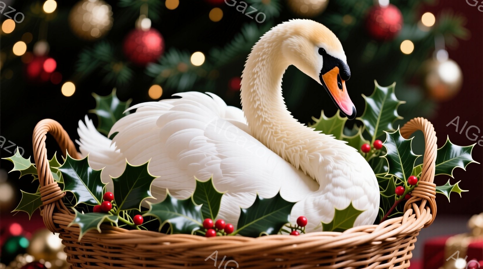 白い鳥の置物が、葉っぱと赤い実で飾られた籠の中に横たわっています。背景には、ぼやけたクリスマスツリーとオーナメントが散りばめられ、暖かくお祝いの雰囲気を醸し出しています。全体的に、静かで平和な休日の情景が表現されています。