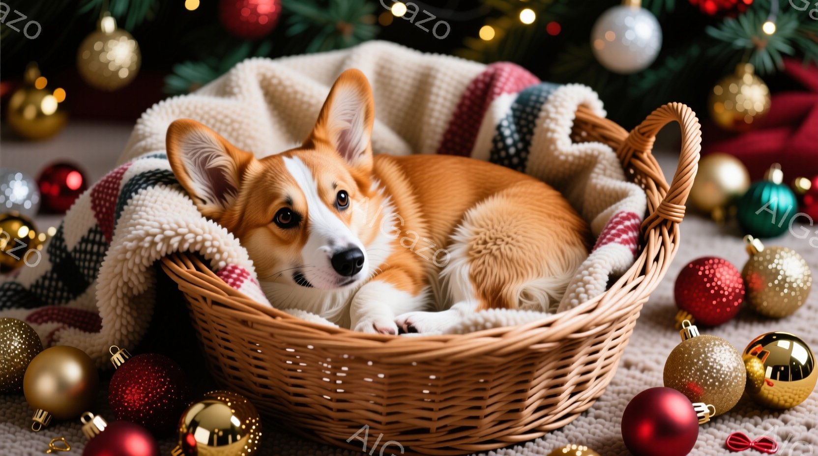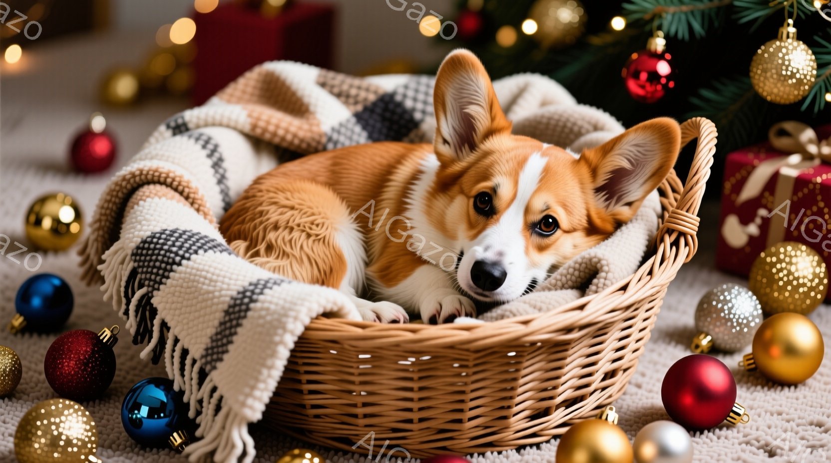 編まれたバスケットの中に横たわるコーギーの犬が写っています。犬は白い胸と足、そして明るい茶色の体を持っており、リラックスした表情で目を少し閉じ、穏やかな雰囲気を醸し出しています。背景には、クリスマスツリーと輝くオーナメントが散りばめられ、暖かくお祝いムードを演出しています。