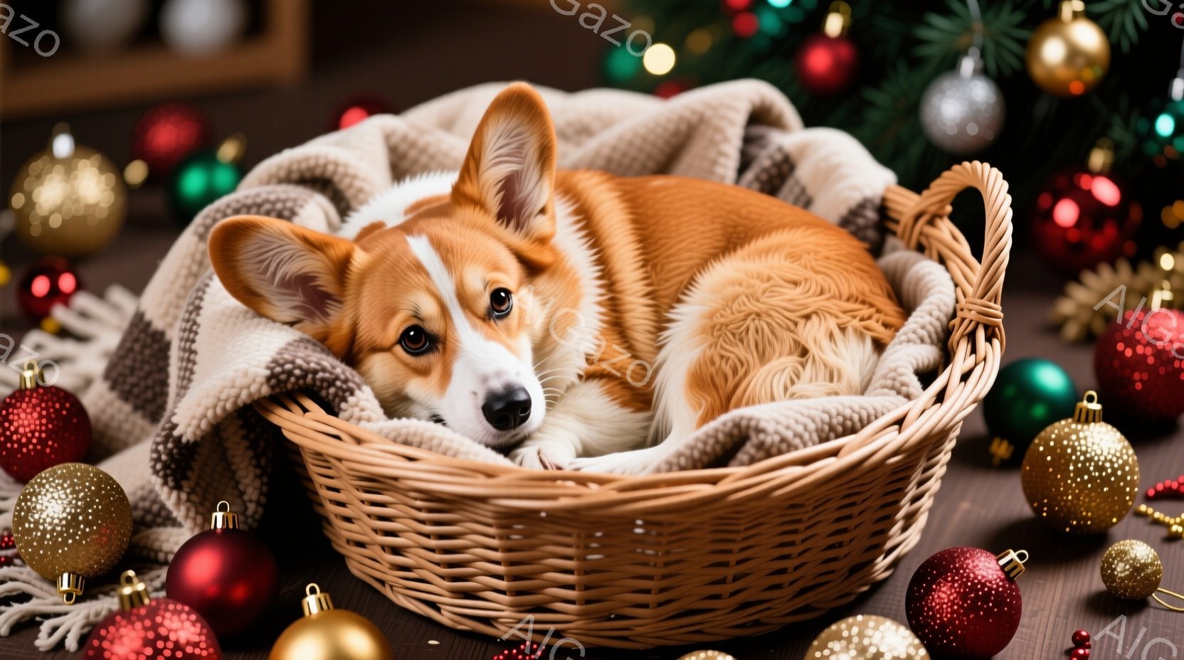 籠の中に、毛並みの美しいコーギー犬が丸まって眠っています。白い縞模様のブランケットが籠から溢れ出し、犬を優しく包み込んでいます。背景には、クリスマスオーナメントやプレゼントボックスが散りばめられ、温かくお祝いムードに満ちた雰囲気が漂っています。